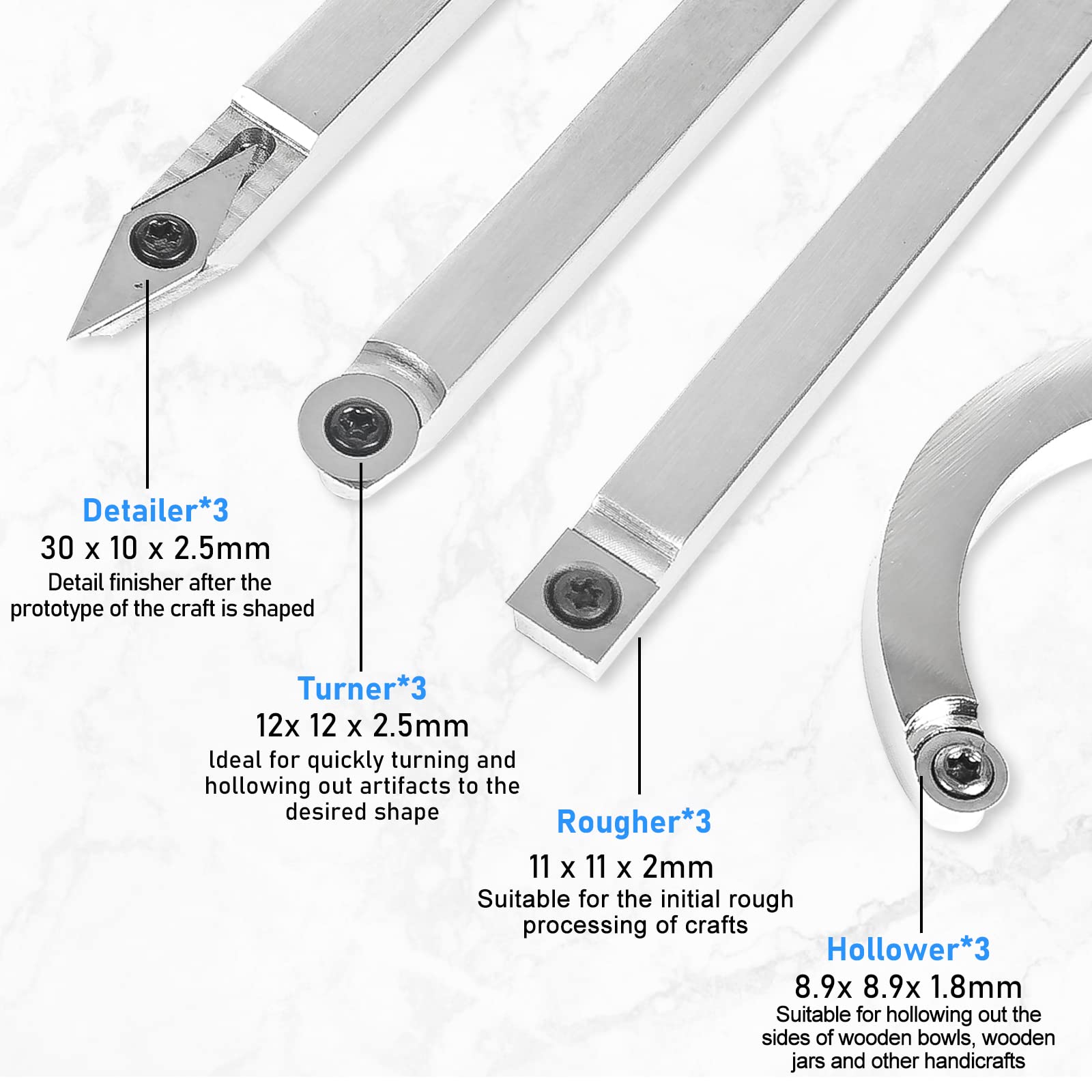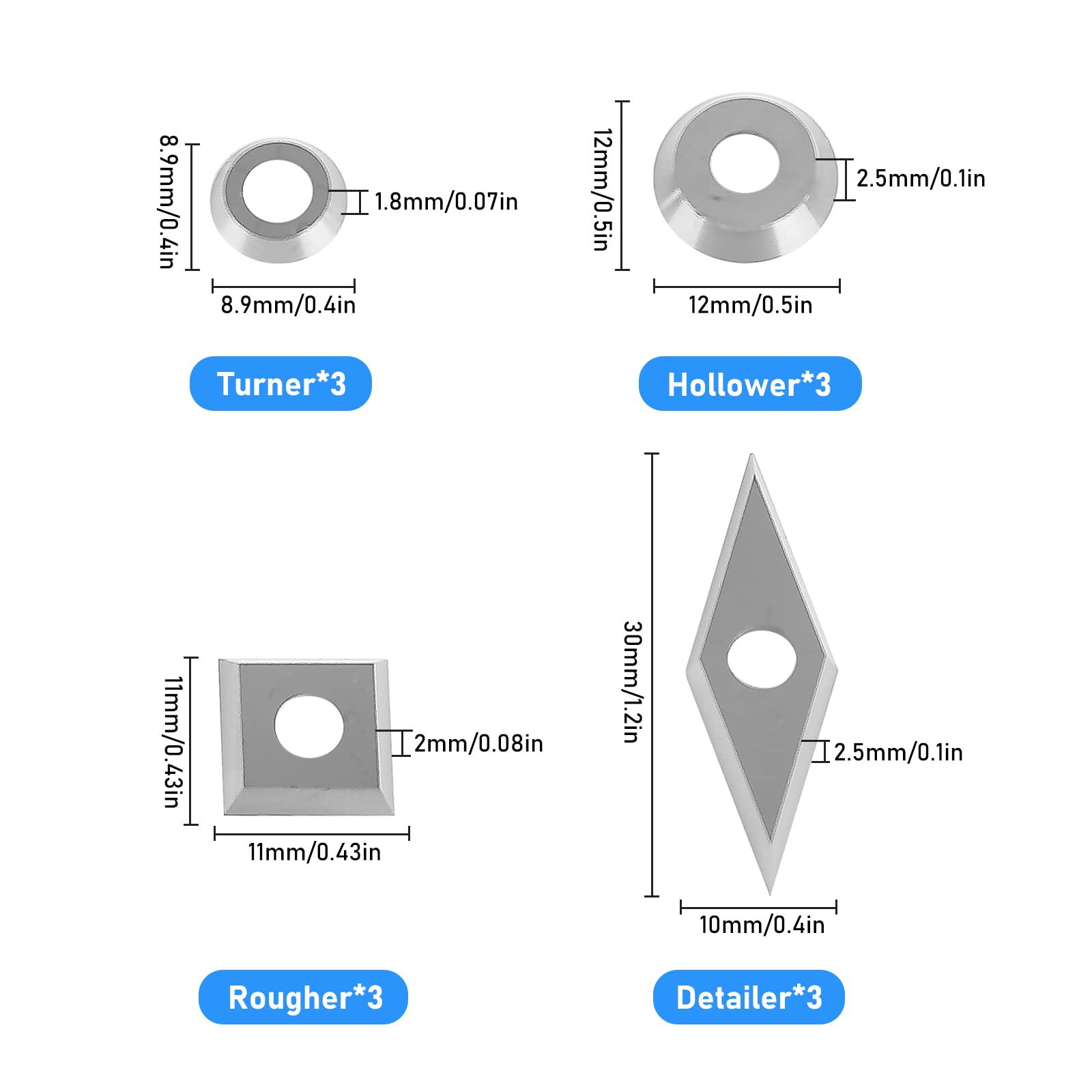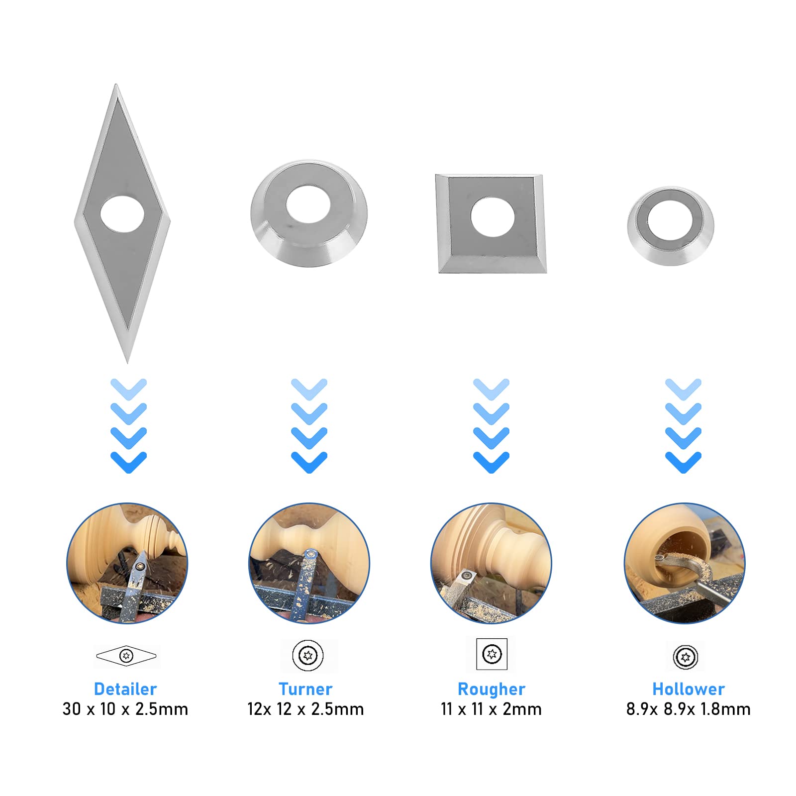 ["🍌【Carbide Insert Cutter Set】Our carbide cutting insert set includes 2 x 11*11mm 30 degree square blade, 2 x Φ12mm round blade, 2 x Φ8.9mm round blade, 2 x 30*10mm diamond blade, and 4 x M4 screws. Different blade shapes are available to meet your various requirements.","🍌【Sharp and Durable】Nano-quality carbide cutting inserts that are durable and do not need sharpening. This indexable insert cutter set is low-noise, quickly dissipates heat, and does not deform, making it a great choice for replacement blades for woodworking turning tools.","🍌【Indexable and Replaceable Carbide Inserts】Eliminates the hassle of sharpening and frequent tip replacements. When the blade is dull, the tip can be turned to a new edge for further use, and when all edges of the tip are dull, it can be replaced with a new blade.","🍌【Easy to Use】Round blades can be used 5-8 times, square blades can be used four times, and diamond blades can also be used twice.","🍌【GUARANTEE】Customer satisfaction is our top priority! If you have any problems, feel free to contact us, our customer service will solve any problem for you."]