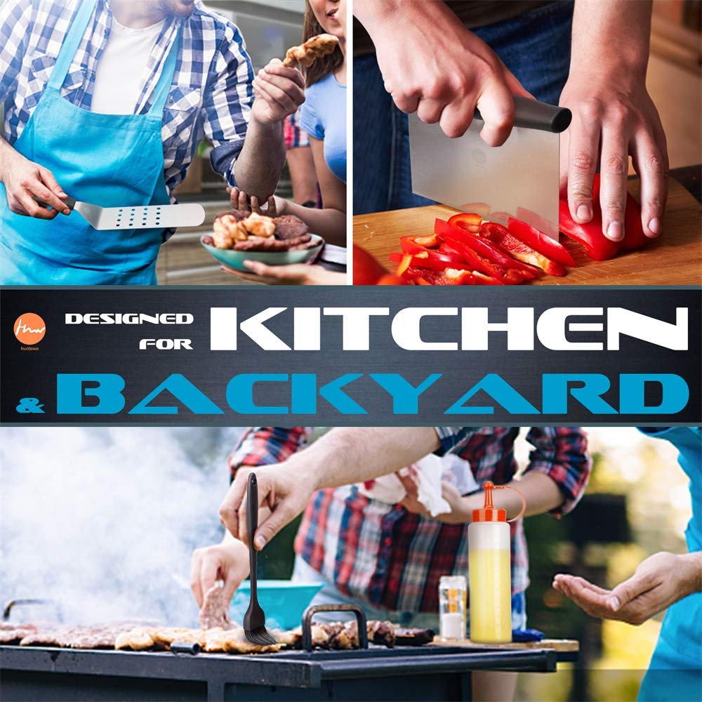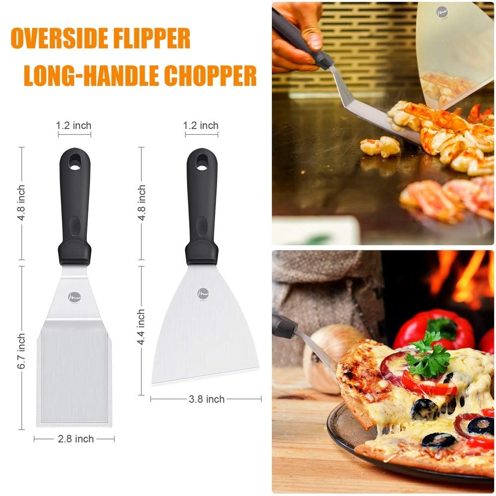 ["CHOOSE THE COMPLETE GRILL TOOL SET TO SAVE TIME AND MONEY - There are 2 Oversized Grill Spatulas for flipping beef cubes, rice, vegetables. 1 regular-sized Grill Turner with 3-sided beveled edge for flipping burgers, pancakes, and cutting bread, sausages. 1 Chopper/Scraper for dicing food and cleaning off griddles. 2 Squeeze Bottles for liquid oil. 1 Carry bag for on-the-go, 1 Tongs and 1 Brush as a bonus.","MULTIPURPOSE GRILL ACCESSORY SET IS FOR OUTDOOR COOKING OR INDOOR KITCHEN - When cooking in your kitchen, just hang these grill spatulas on the wall if needed. If you want to grill outdoors, simply place these grill turner tools in our sturdy carrying bag. No need to worry about forgetting the necessary accessories! All tools can be safely put in the dishwasher.","YOU CAN GET STARTED QUICKLY EVEN IF YOU'VE NEVER USED THE BBQ GRILL TOOL SET - Whether you are a professional chef or an amateur, our griddle spatula is the best for you. A must-have for grill fans who love to celebrate in the garden or outdoors. For dads who enjoy cooking with the family, for chefs working in hotels or street vendors. By cooking your food on the stovetop with it, you will become a professional grill master in no time!","IDEAL GIFT FOR YOUR FAMILY OR FRIENDS - Our griddle spatula set is made of high-quality stainless steel, rust-proof, durable, and easy to clean, also heat-resistant. High-quality thick metal and solid construction can withstand deformation or breakage of a heavy press. The handle is made from 100% food-grade silicone, non-toxic and tasteless, high-temperature resistant, no deformation. Griddle grill turner is the best grill gift for men!","BUY WITH CONFIDENCE - 30 days no reason to return the product. Our grill spatula set has been third-party tested for durability and functionality before being sent to you. We try our best to ensure that products satisfy every customer. If you have any questions or are not satisfied with our products, please feel free to contact us. We will definitely solve your problem!"]
