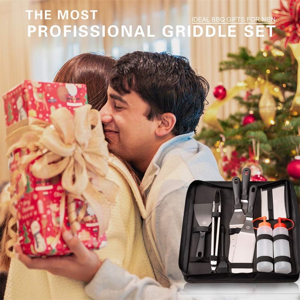 Careful Grill Spatula Set, Stainless Steel 9 Pcs Flat-Top Grill Tool Set, Professional BBQ Accessories Grill Turner with Brushes Bottles and Carry Bag, Ideal for Outdoor Grilling, Teppanyaki, and Camping