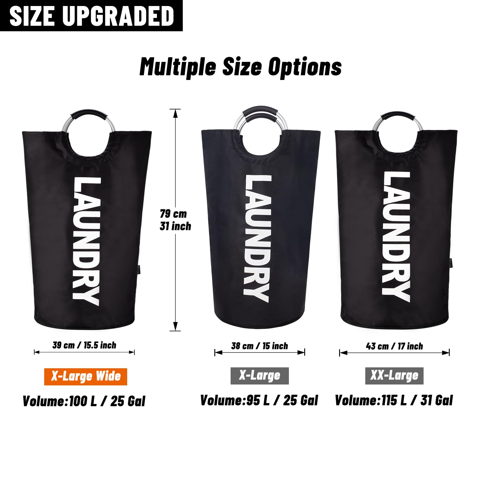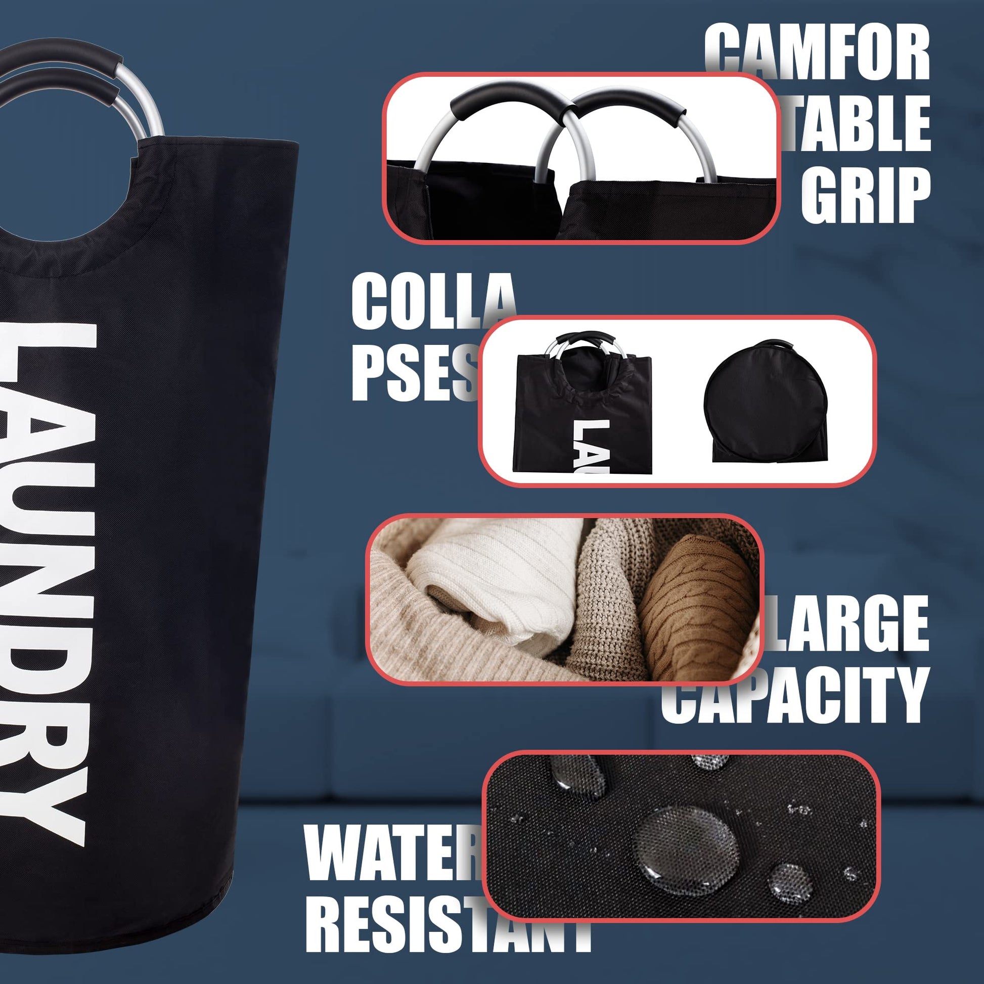 ["Easy to store, more convenience"] The collapsible laundry basket can be folded flat and stored compactly when not in use. The sturdy aluminum frame provides high load-bearing capacity, while the padded handles ensure comfortable carrying. The large laundry basket offers functionality and comfort in one.