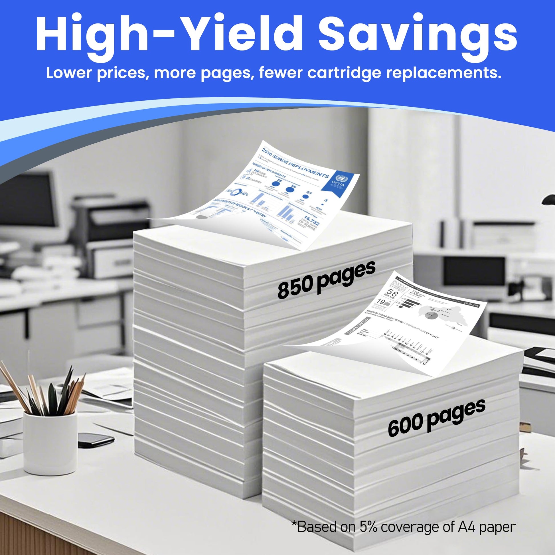 XXL High-Performance Efficiency: Black: approx. 600 pages, Color (Photo Black, Cyan, Magenta, Yellow): approx. 850 pages (ISO/IEC 24712 Standard, 5% coverage).