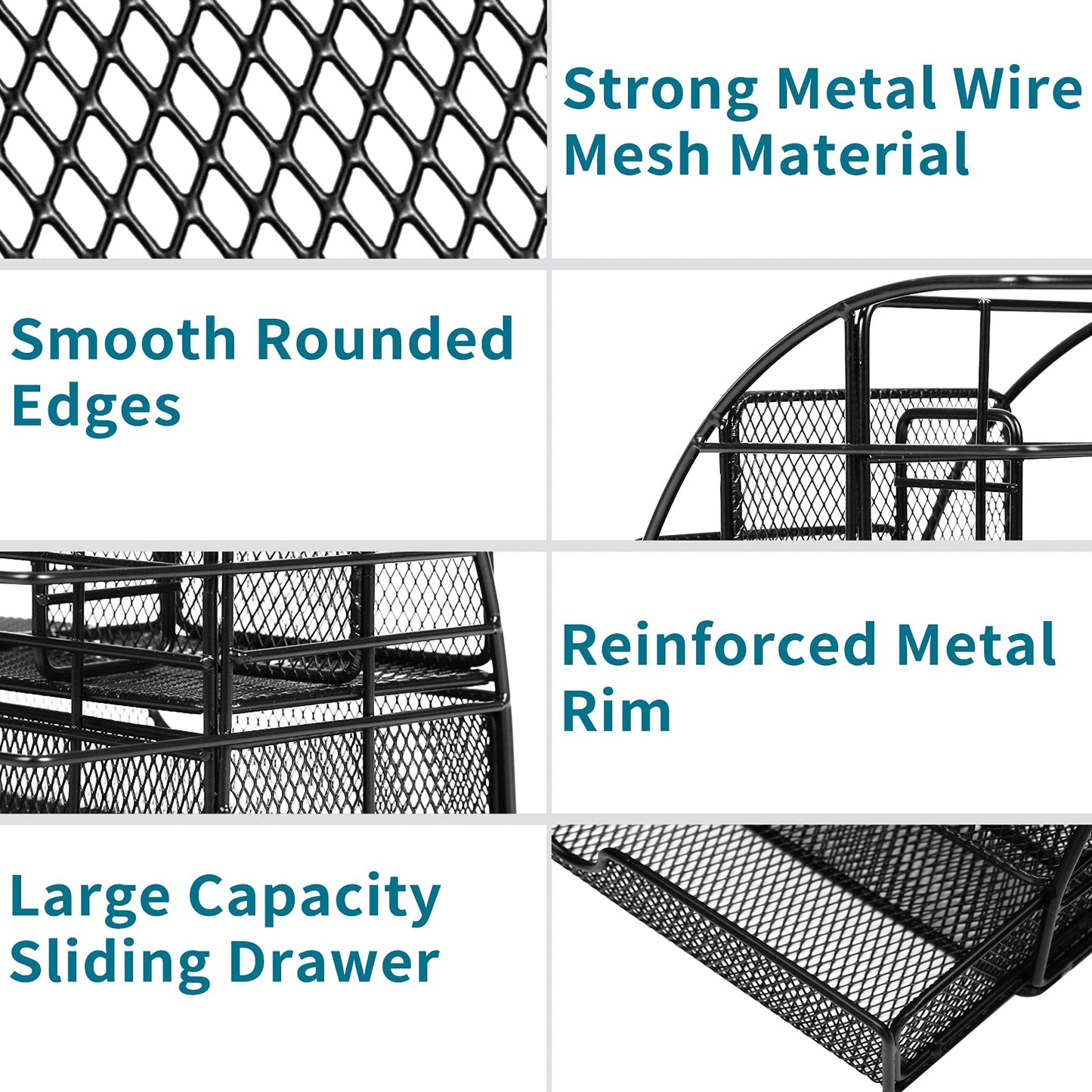 ["✏️ All-in-One Desk Organizer Set: All-in-One desk organizer has 6 compartments (5 pieces + 1 drawer) and 1 pen holder and 72 desk accessories (7 large binder clips + 15 small binder clips + 20 push pins + 30 paper clips) for sorting and storing","✏️ Durable, sturdy, and stylish material: The desk organizer features a powder coating and electroplating, wear-resistant, antioxidative, and durable, will not fade. The rounded corners with metal edges and trim give the desk a visual appeal","✏️ Space-saving: The desk organizer has enough storage space to accommodate your desk supplies, such as pens, post-its, rulers, business cards, and more. Also great for organizing makeup and small household items. Keep it organized, find everything you need","✏️ Creativity: Desk organization with black metal finish design, simple and stylish, easily matches with other office accessories and surrounding decorations. Suitable for home, office, classroom, etc.; beautiful on desk, living room, bedroom, dresser, coffee table, shelf, etc","✏️ Buy with 100% confidence: The desk organizer comes fully assembled and can be used immediately. We promise 100% satisfaction experiences, if you have any questions, we are happy to offer either a refund with no questions asked or a replacement. Dimensions: 22.0 x 14.0 x 15.5 cm"]
