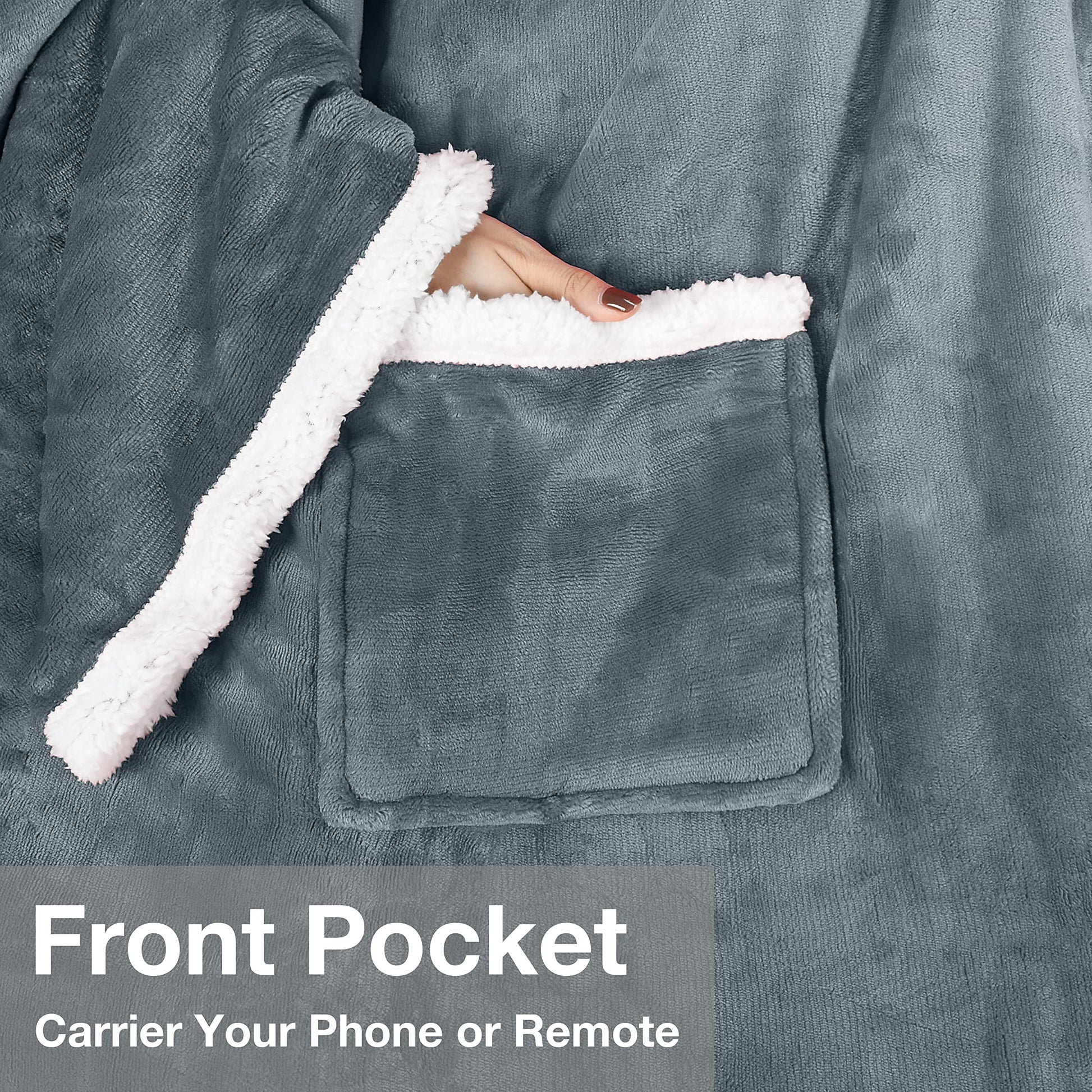 "Practical Design - With this cuddle blanket with sleeves, you can enjoy the warmth while keeping your hands free. Whether you're flipping through books or watching TV and operating the remote control, you can move freely, making you feel more comfortable and cozy. You can also store your mobile phone or remote control in the front pocket, making your life more convenient.",