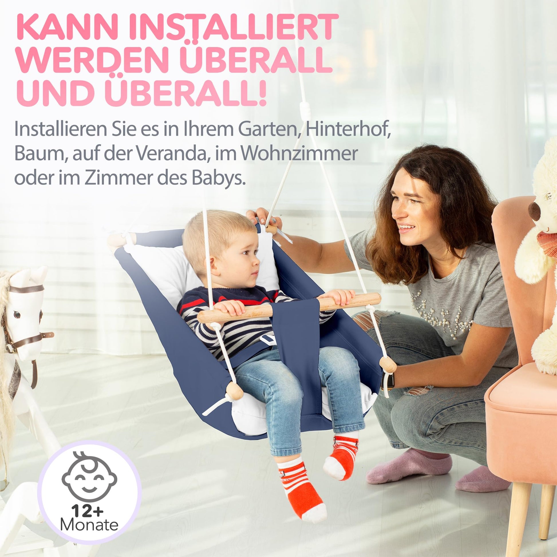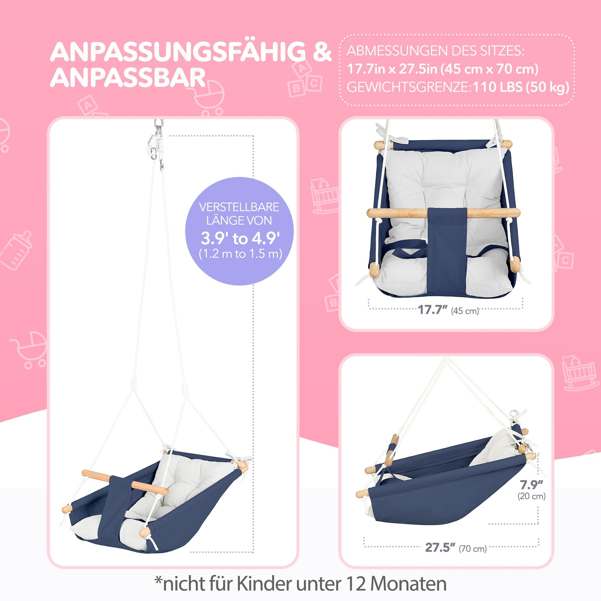 "Durable for daily use - The soft canvas of our hammock swing is machine washable. This sturdy baby/toddler swing seat measures 17.7 inches x 27.5 inches (45 cm x 70 cm) with a weight capacity of 110 lbs (50 kg). It also comes with sturdy installation hardware.",