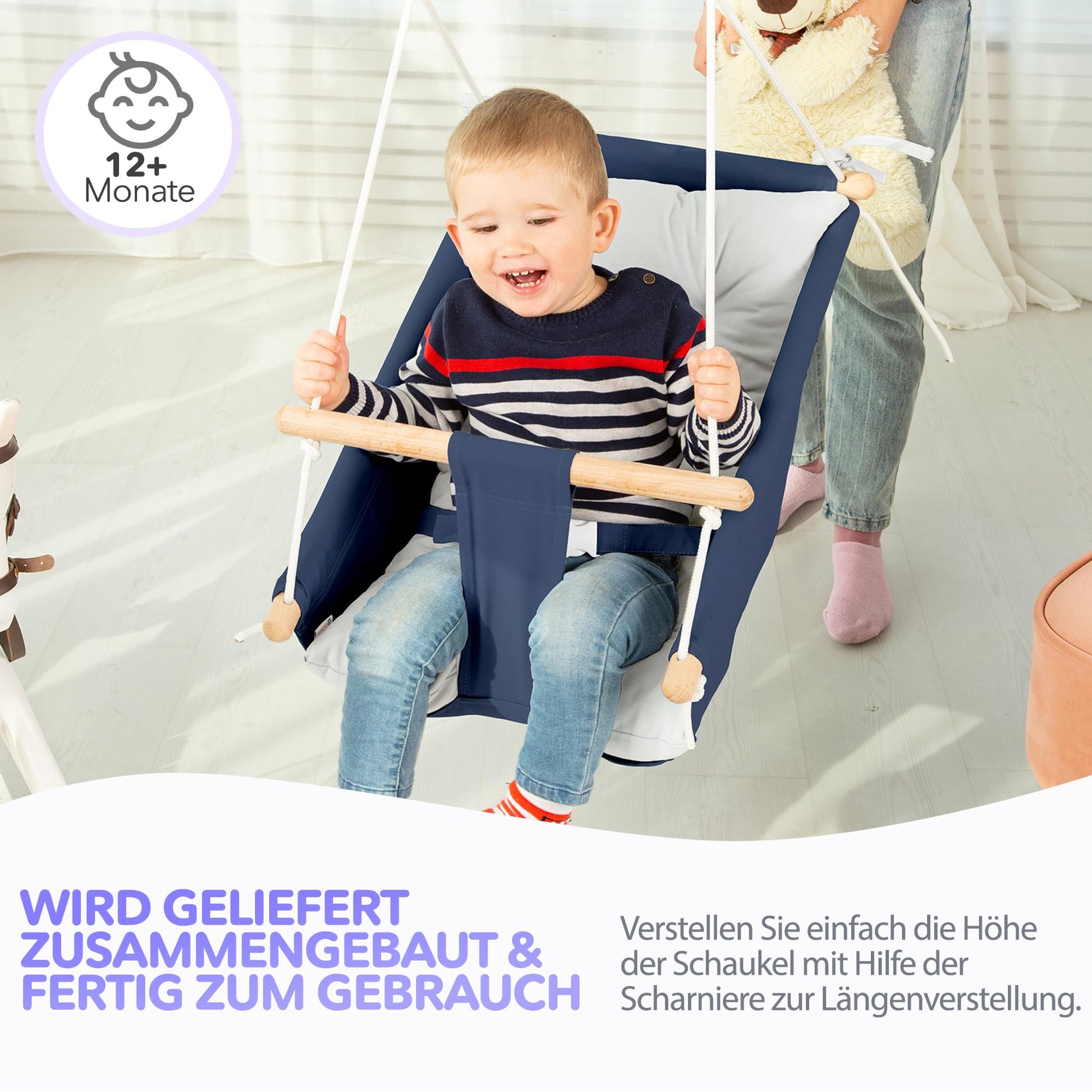 "Comes fully assembled - Skip long hours of assembly with this ready-to-use baby swing set! It comes equipped with an easy height adjustment system. Before/after installation, you just need to adjust the length of the ropes to your preferred height.",