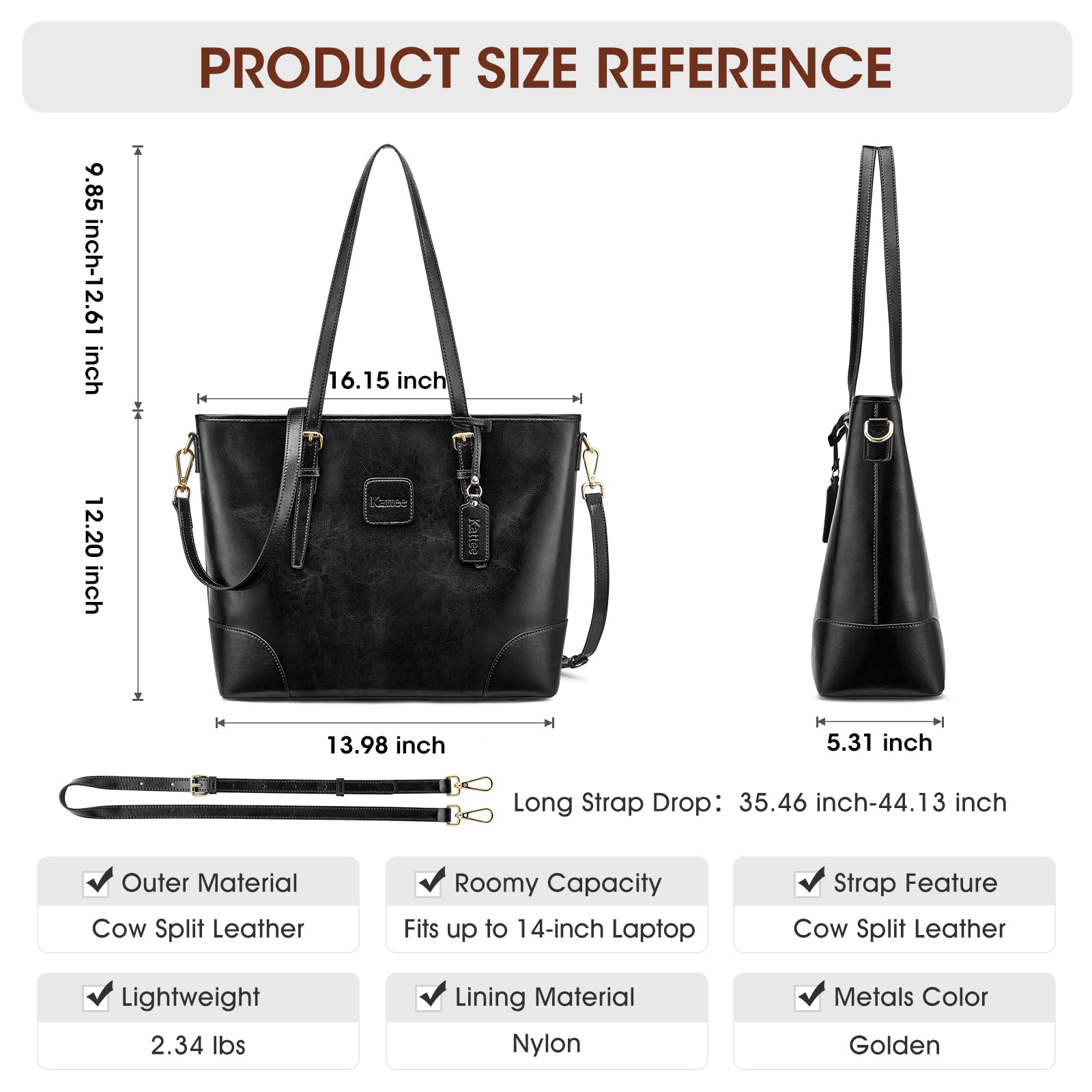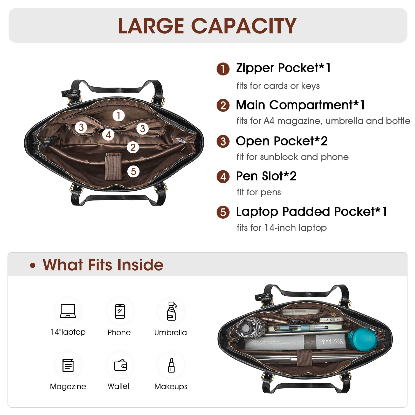 【LARGE CAPACITY】: Dimensions: 16.15" (top L)/ 13.98" (L)* 5.31"(W)* 12.20"(H). Weight: 2.34 pounds. With a padded laptop inner compartment, this women's leather bag can accommodate a 14-inch laptop, A4 magazines and books, a water bottle, a lunch box, an umbrella, a cosmetic bag, and other essentials.