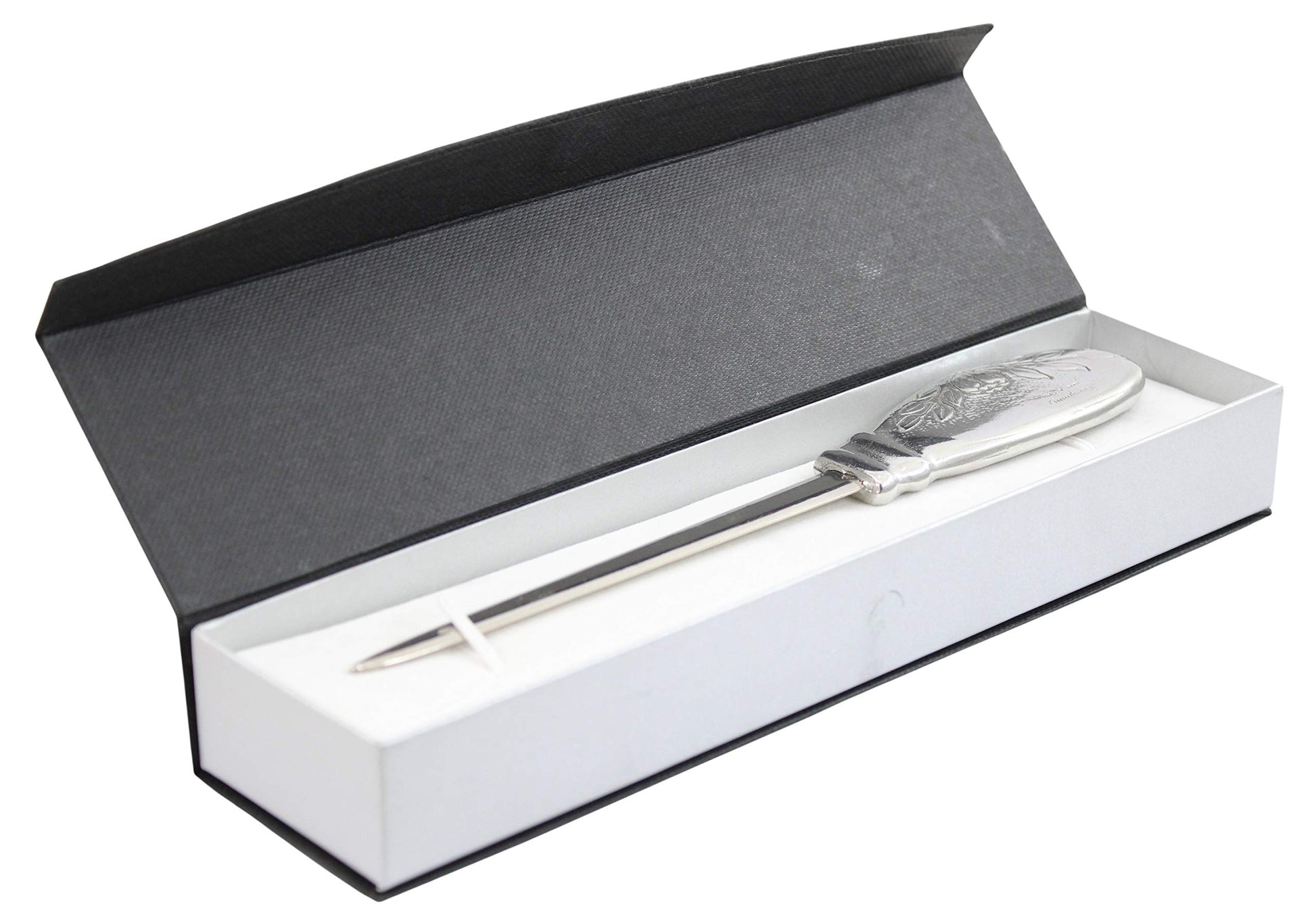 ["Letter opener, elegant and stylish opener. Completely made in Italy by Master Roberto Cavagnini and his team.", "Material: Handle in pewter (tin alloy) | Blade in stainless steel", "Gift box: The paper cutter comes in an elegant gift box with magnet closure, as shown.", "Production: This letter opener is a handmade product, made in Italy. Inside the packaging, there is an authenticity certificate.", "Personalization: We can engrave your initials on the metal handle. Click on the 'Customize Order' button to share the letters you want to engrave. If you do not wish to have engraving, proceed without entering anything."]