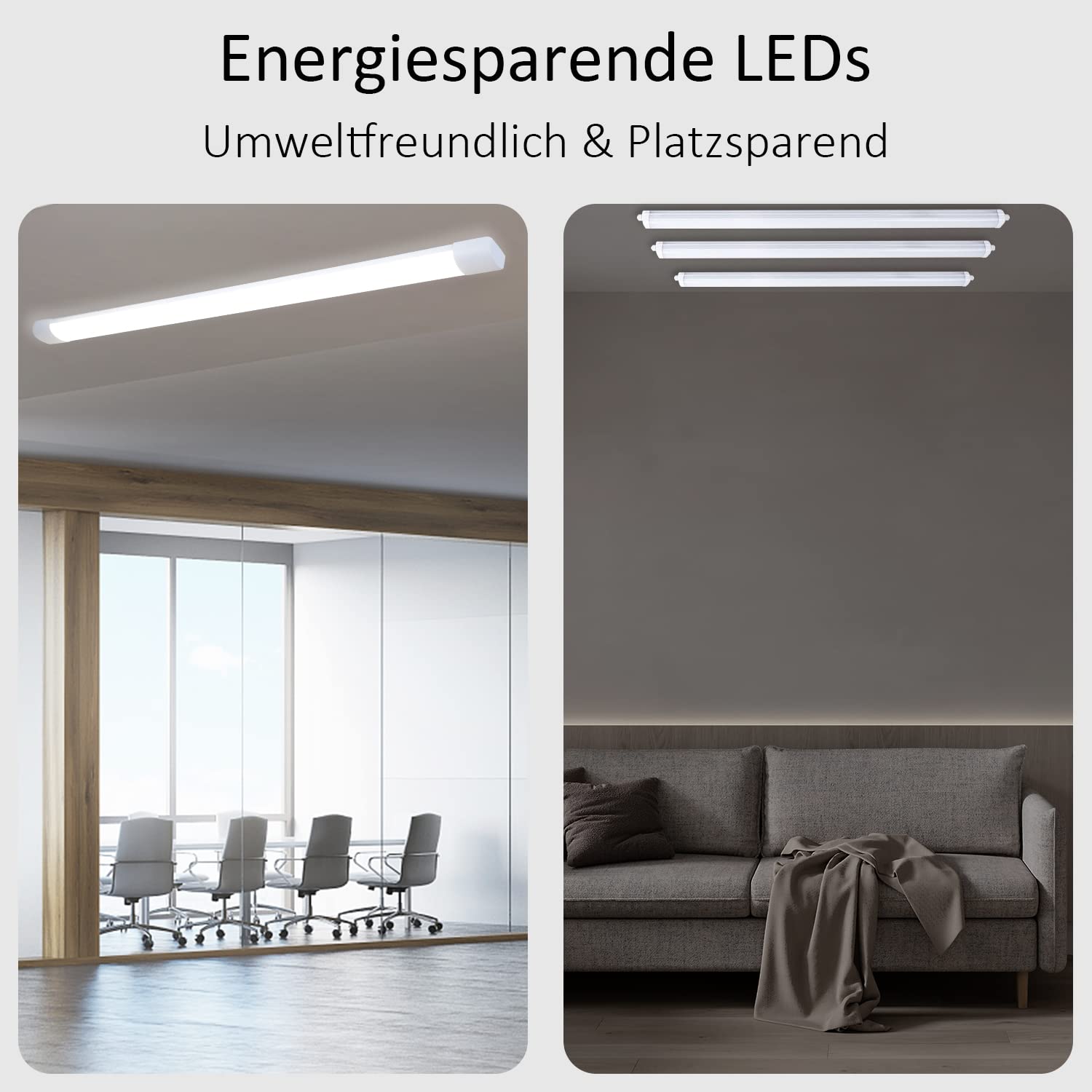 Eye protection: With a white polycarbonate shade, this LED tube light is extremely robust and ensures uniform light transmission without causing unpleasant glare. This long LED ceiling light emits soft and uniform light without flickering, protecting your eyes from irritation, especially for energy-efficient illumination of office spaces or other workspaces.