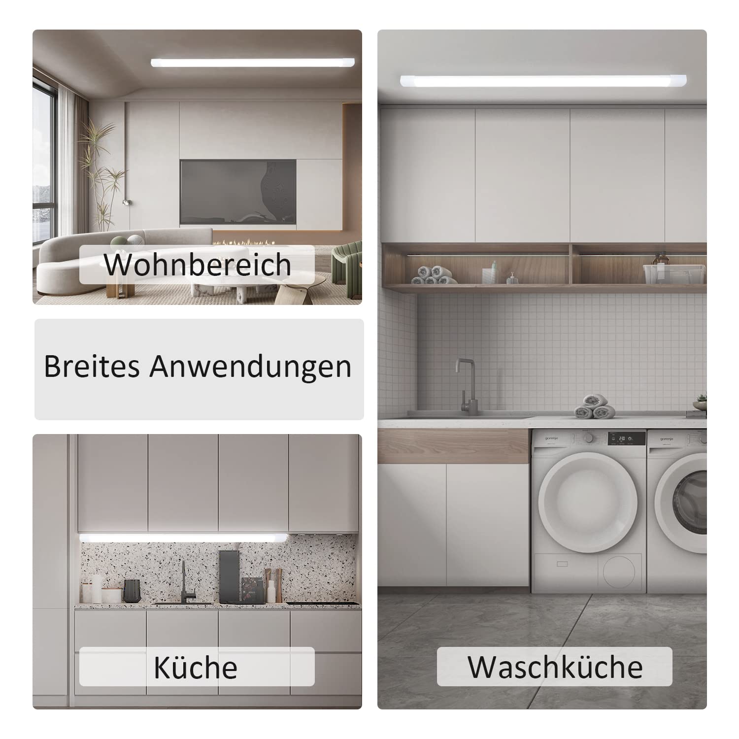 "Super bright & Energy-saving: Equipped with an integrated LED module, the moisture-proof luminaire offers maximum durability and energy efficiency thanks to modern technology. The 180° wide-beam light of the LED 120 cm office ceiling light shines with a universal white 4000 K light and impresses with a light output of 106 LM/W, reliably providing orientation and safety even in parking garages or underground garages.