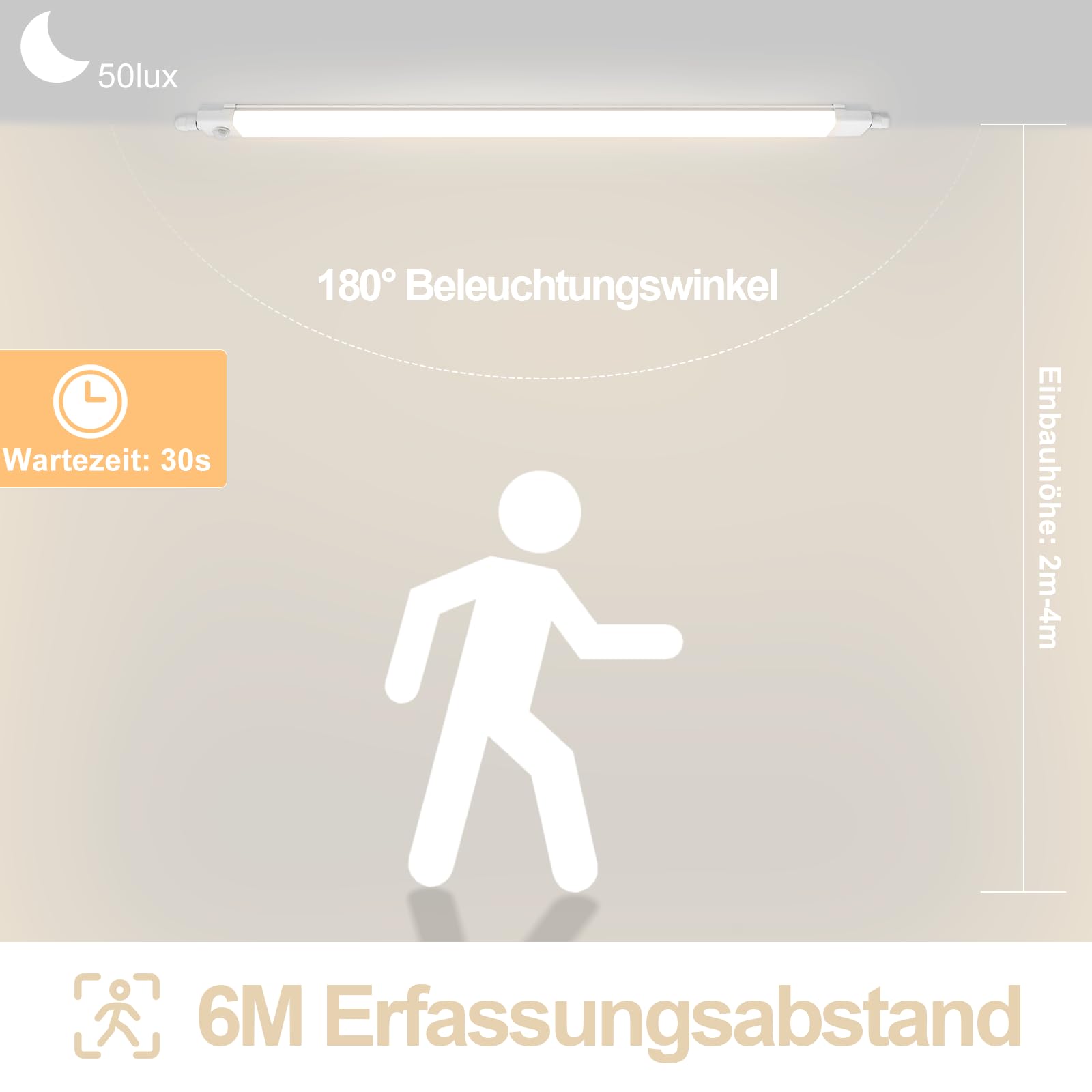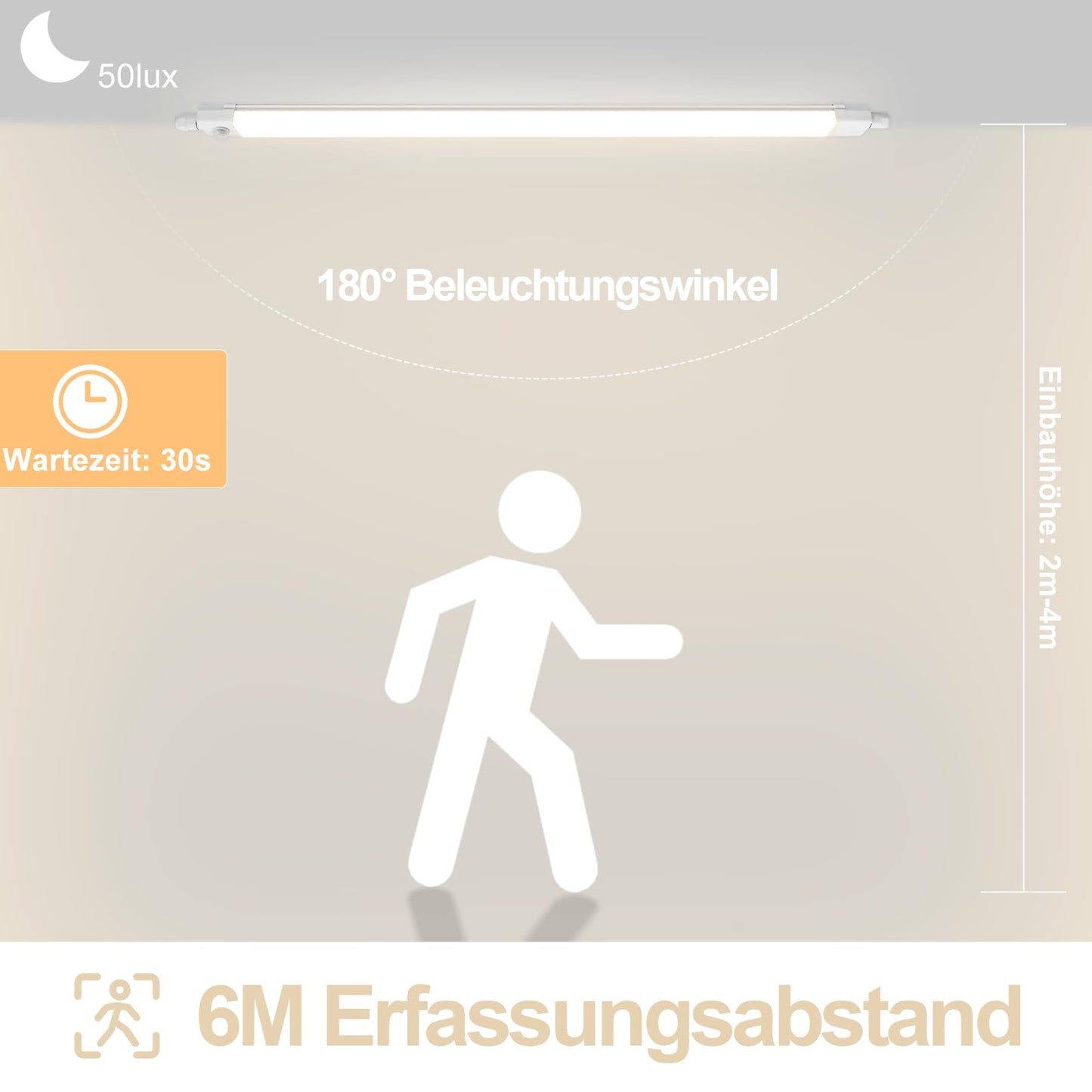 šćTechnical DataćSize: 47.2"*2"*1.2" - Protection class: IP65 - Light source: LED - total 36W - Installation height: 6.5ft-13.1ft - Light conditions: Twilight and night environment (<50Lux) - Lighting duration: 30S - Detection range: 19.7ft; 180 ° - Sensor type: Infrared sensor - Impact resistance: IK08 - Light color: 4000K - Color rendering: CRI>80 - Installation method: Snap-in - Warranty: 2 years - Customer service: 24H