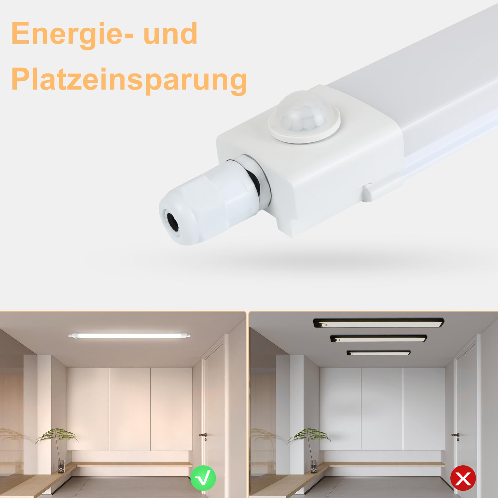 šćEye ProtectionćWith a white polycarbonate shade, this LED tube light is extremely sturdy and ensures an even transmission of light without causing unpleasant glare. This long LED ceiling light emits soft and uniform light without flickering, protecting your eyes from irritation, especially when illuminating office spaces or other work areas energy-efficiently.