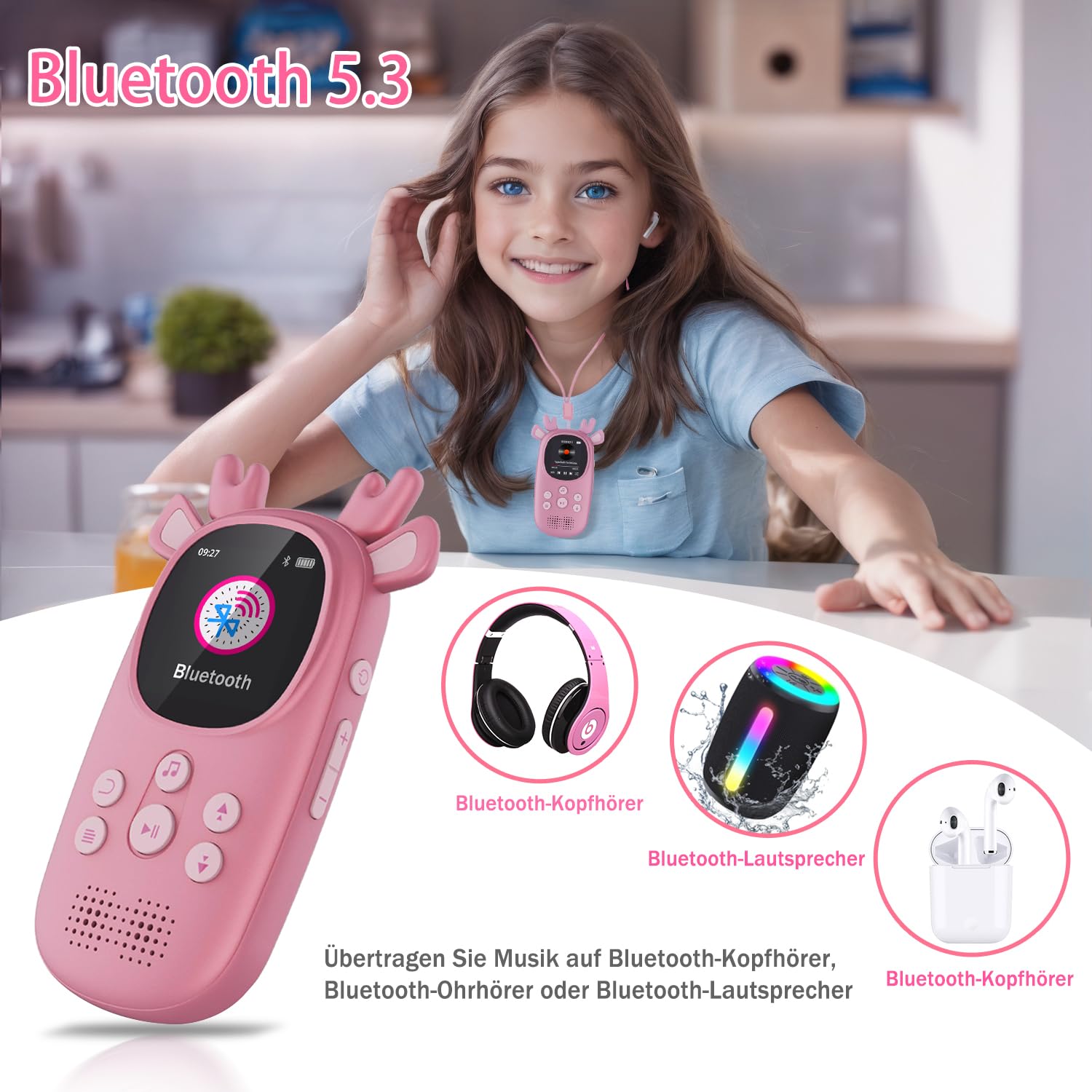 🦌【Adorable Reindeer Design】🦌 This MP3 player is designed in a charming reindeer design and is in a soft pink color, perfect for small children's hands. Its cute appearance makes it a charming companion that is more than just a music player.