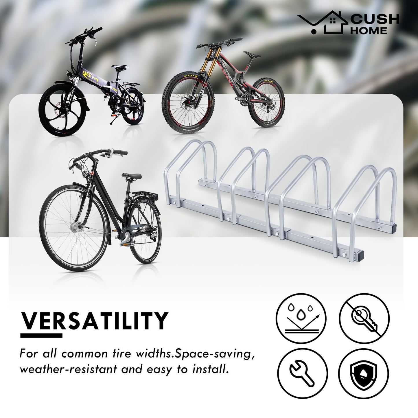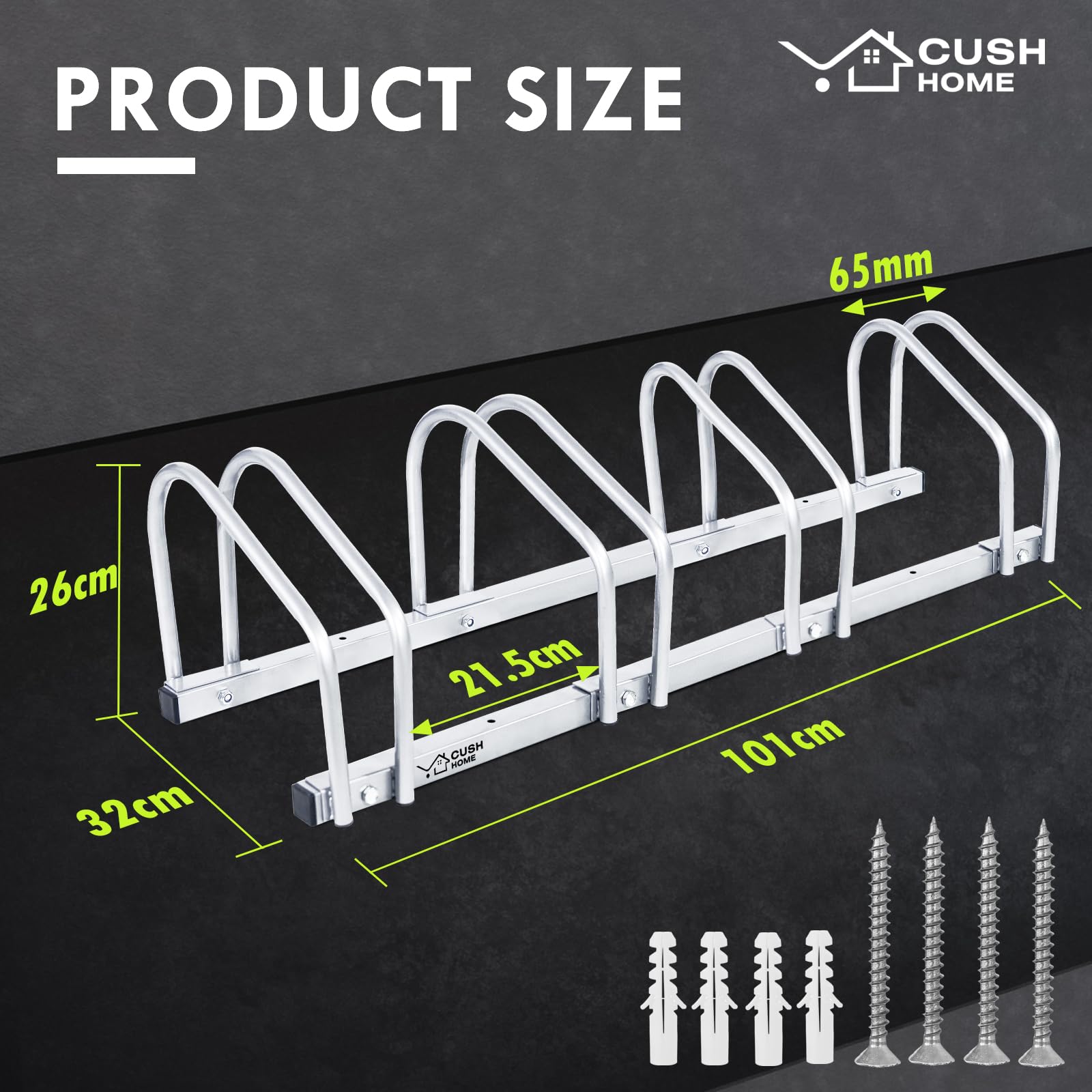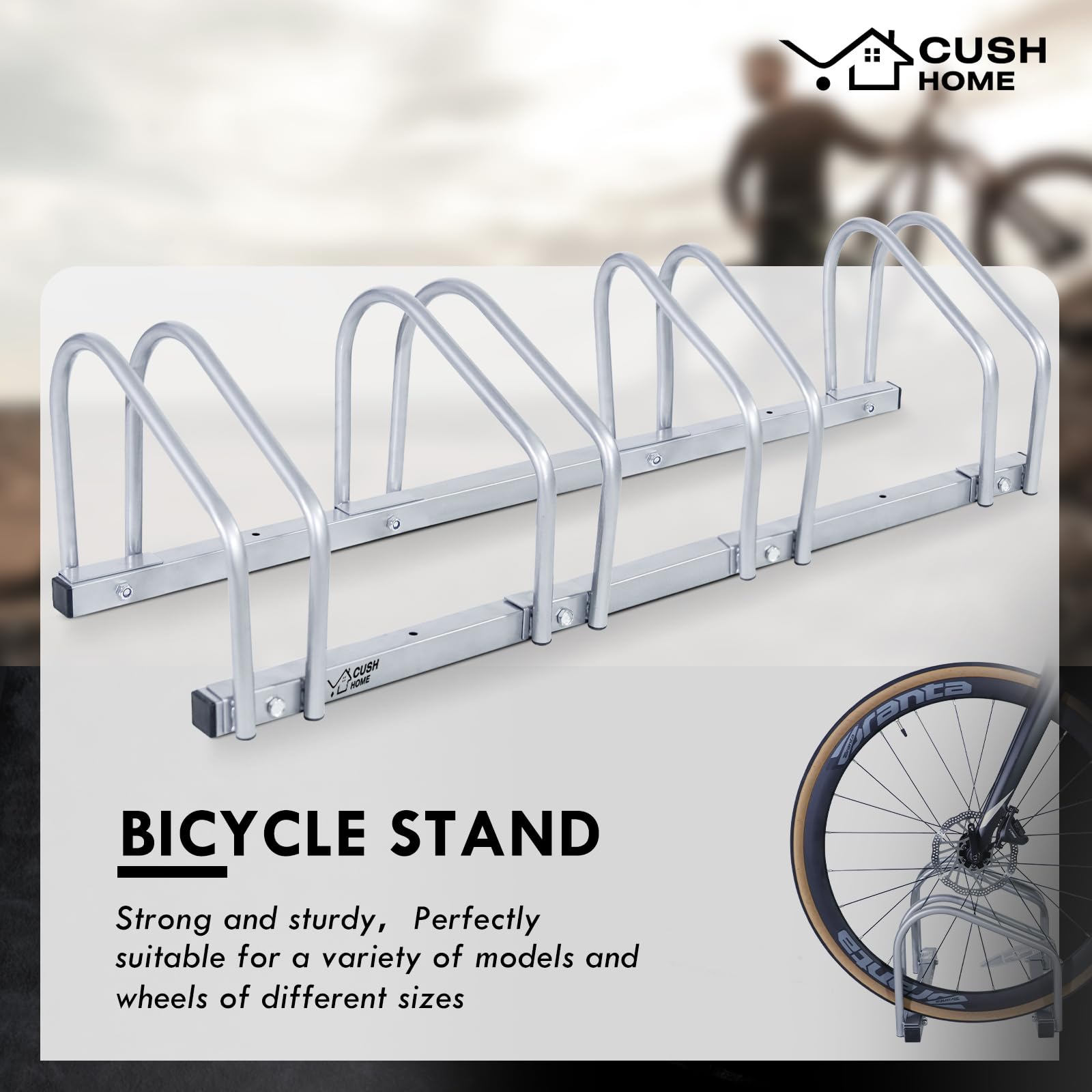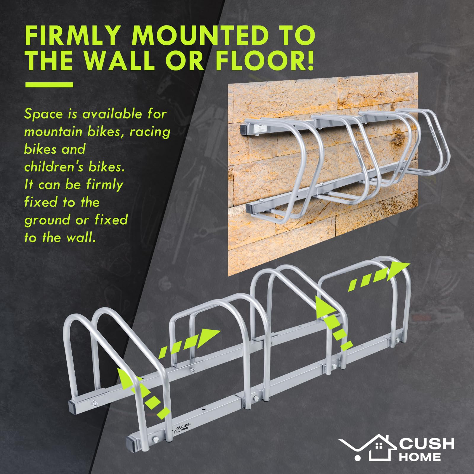 "Stable bike rack for 4 bikes, suitable for tire widths under 2.6 inches. Pre-drilled holes and included accessories make it easy to mount on the floor. The bike stand accommodates various types of bikes such as kids' bikes, mountain bikes, road bikes, etc. Flexible bike rack for garage, yard, basement. Adjustable to different needs. Park your bikes securely and space-savingly to avoid clutter."