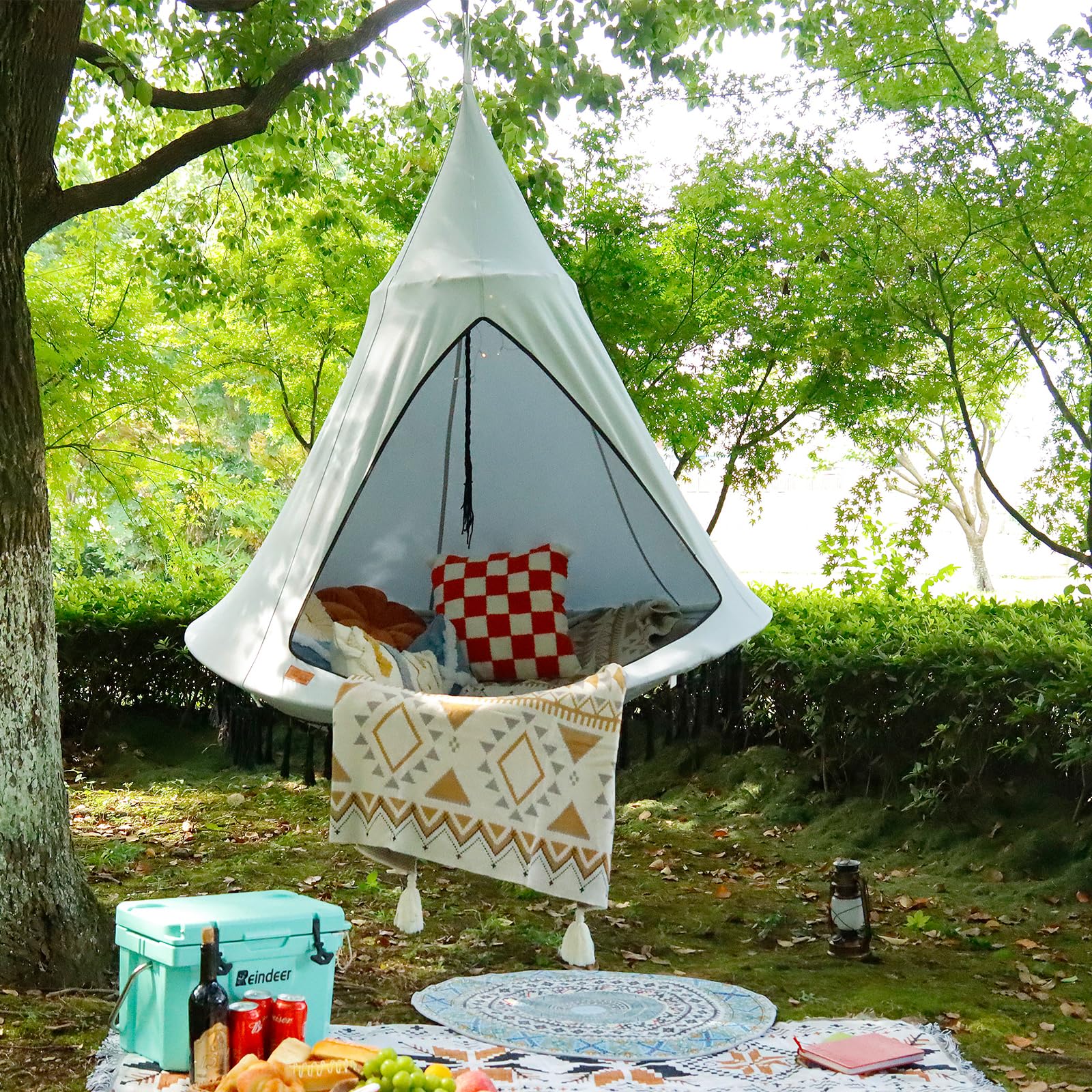 Versatile application: The swing can be used indoors and outdoors, mounted on roofs, trees, and pillars. Thanks to its light and fringes, a cozy atmosphere is created. (Please note that while this tent is intended for outdoor use, it should not be permanently set up outdoors. Also, avoid exposing the product to rain)"