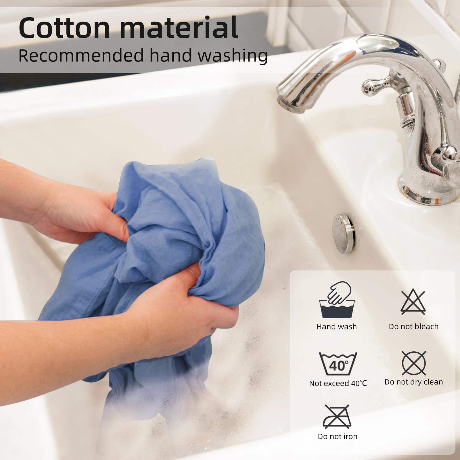 Washing Method: Pure cotton material, hand wash recommended, water temperature not exceeding 40 °C; do not bleach; do not iron; do not dry clean.