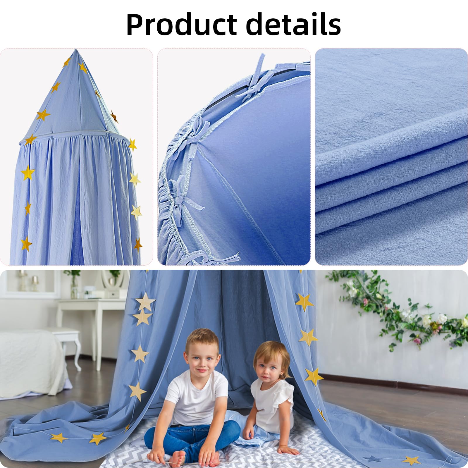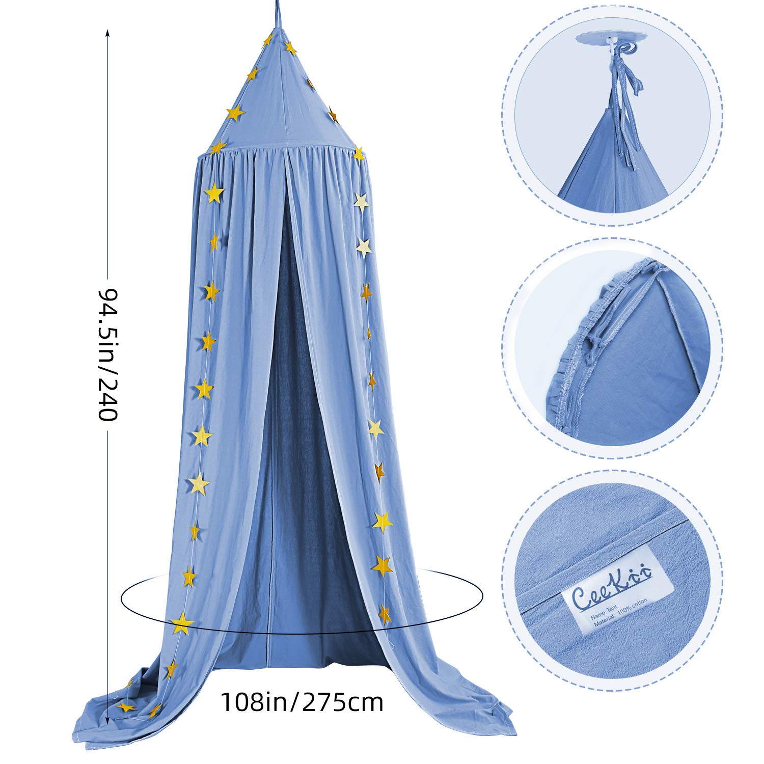CeeKii Canopy Nursery Bed Canopy, Bed Curtain Baby Room Decor Mosquito Net for Princess Play Tents Baby Bed Bedroom Decoration with Star Garland (Blue)