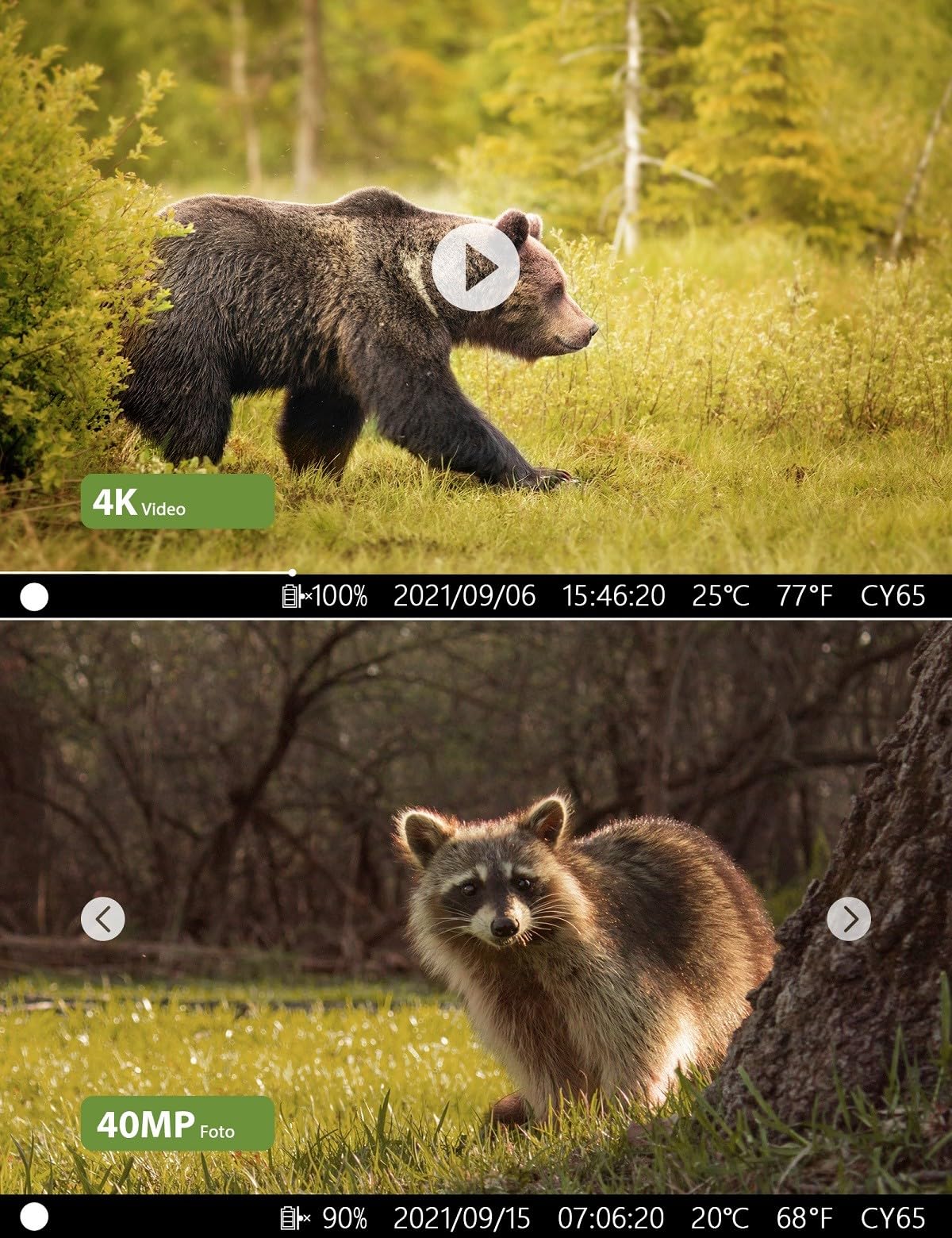 ["Advanced 40MP Images & 4K-30FPS Videos: This trail camera captures 40MP images and 4K videos with higher resolution and color saturation to show you a vibrant wildlife. The built-in 2.0 inch LCD screen allows you to view animal videos and photos more intuitively without transferring them to another device.","0.2s Trigger Speed & 120° Detection Range: The CY65 trail camera is equipped with three improved PIR sensors. You can activate or deactivate the side sensors in the menu to adjust your detection field. The fast trigger speed and extended detection range provide more precise and efficient motion detection, allowing you to enjoy every image of wildlife in a wide field of view.","WiFi Connectivity & Easy Operation: This trail camera features built-in WiFi-Bluetooth function and easily connects to your phone via the 'WILDLIFE CAM' app. This allows you to view and download images and videos to your phone without having to remove the camera from its installation location. You just need to stay within the WiFi signal range (32ft). (Note: The trail camera does NOT work with your home router system.)","Improved Night Vision & High Camouflage: The trail camera features 36pcs low-glow LEDs for clear night vision in a range of 65ft. Even in the dark night, this wildlife camera clearly records every animal movement. The automatic fill light technology prevents overexposure or underexposure issues. This hunting camera has a camouflage shell that blends perfectly with nature and is not easily detected by animals.","Durability & Versatility: Thanks to the tighter waterproof design, this trail camera withstands harsh weather and conditions. The integrated semi-open cover design allows you to check the camera angle directly via the LCD screen. This hunting camera has multiple functions such as target recording time, time lapse, sound recording, password protection, and timestamp (including date/temperature) (NOTE: SD card and batteries are NOT included)."]