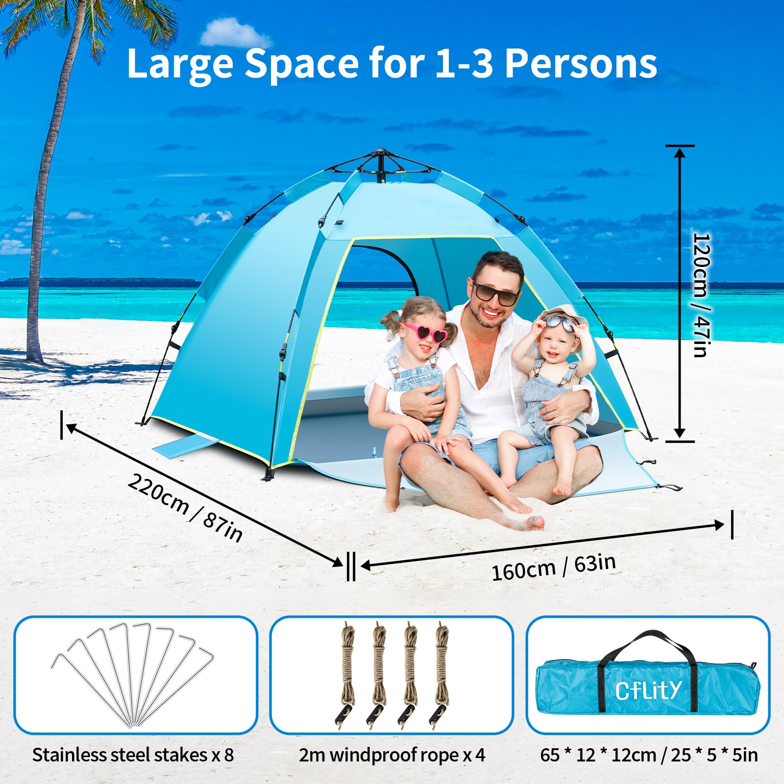 Cflity Beach Shelter, 1-3 Person Automatic Instant Pop Up Beach Tent, UV Protection 50+ Sun Shelter Large Portable Extra Light Pop Up Tent with Double Door for Garden, Fishing, Picnic.