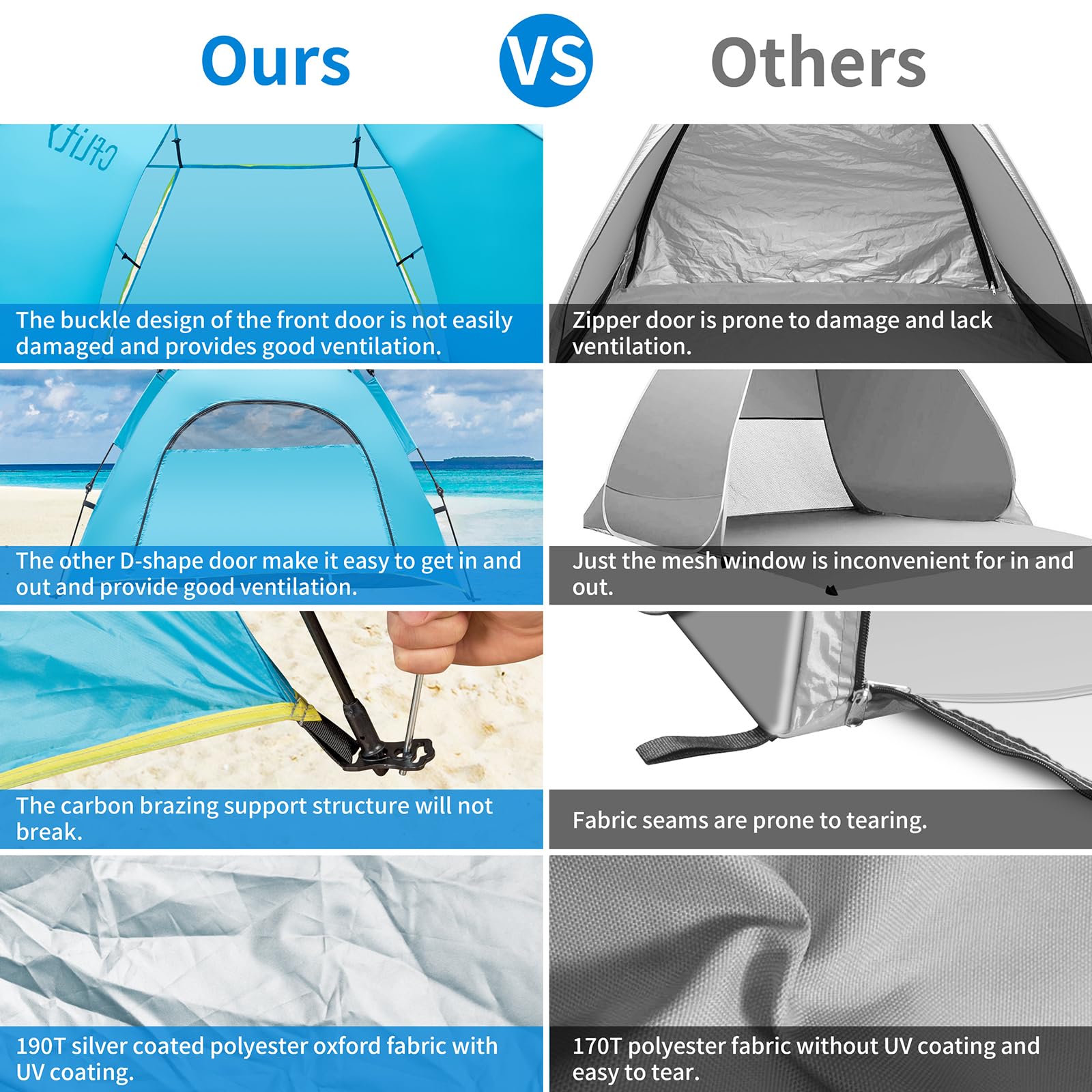 "Advanced Automatic Pop Up Beach Tent: With the design of the automatic hydraulic system, our beach tent is easier to open or fold than traditional tents and can be closed in seconds. The carbon-fiber welded support poles eliminate the worry of pole bending. In addition, the 2 sandbags, 4 wind ropes, and 8 steel stakes enhance the wind resistance and stability of the tent.