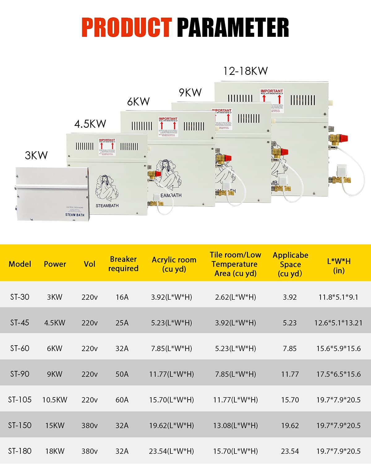 ["VOLTAGE OPTIONS - When selecting this product, the standard voltage is 220V. If you want to choose the 380V model, or want 220V to 380V wiring circuit method, please be sure to consult our technical team online to confirm.","PERFECT PERFORMANCE - With the unique double-tank technology, this luxurious shower steam generator can quickly and stably produce soft and gentle steam in 3-5 minutes, while minimizing all disturbing operating noises and providing people with a pleasant steam sauna experience.","COMPLETE FUNCTION - In addition to the automatic drainage function, there is also a waterproof LED digital display with the function of automatically setting the working time (1-60 minutes) and the adjustable temperature (35-55℃/95-131℉). In addition, long-distance signal transmission is possible up to 50 meters.","SAFETY PROTECTION - The safety concepts of this complete steam shower combination include overheat protection, water shortage protection, and high-pressure protection in the water tank.","EASY TO INSTALL - In addition to the special installation instructions for the German version, this compact sauna spa machine comes with a clear wiring diagram and installation video, as well as detailed technical product parameters on the side for your reference."]