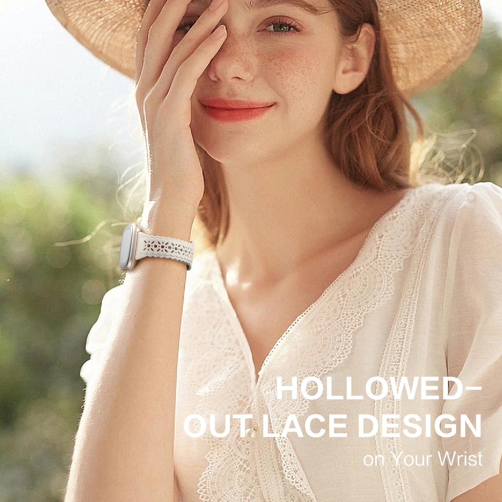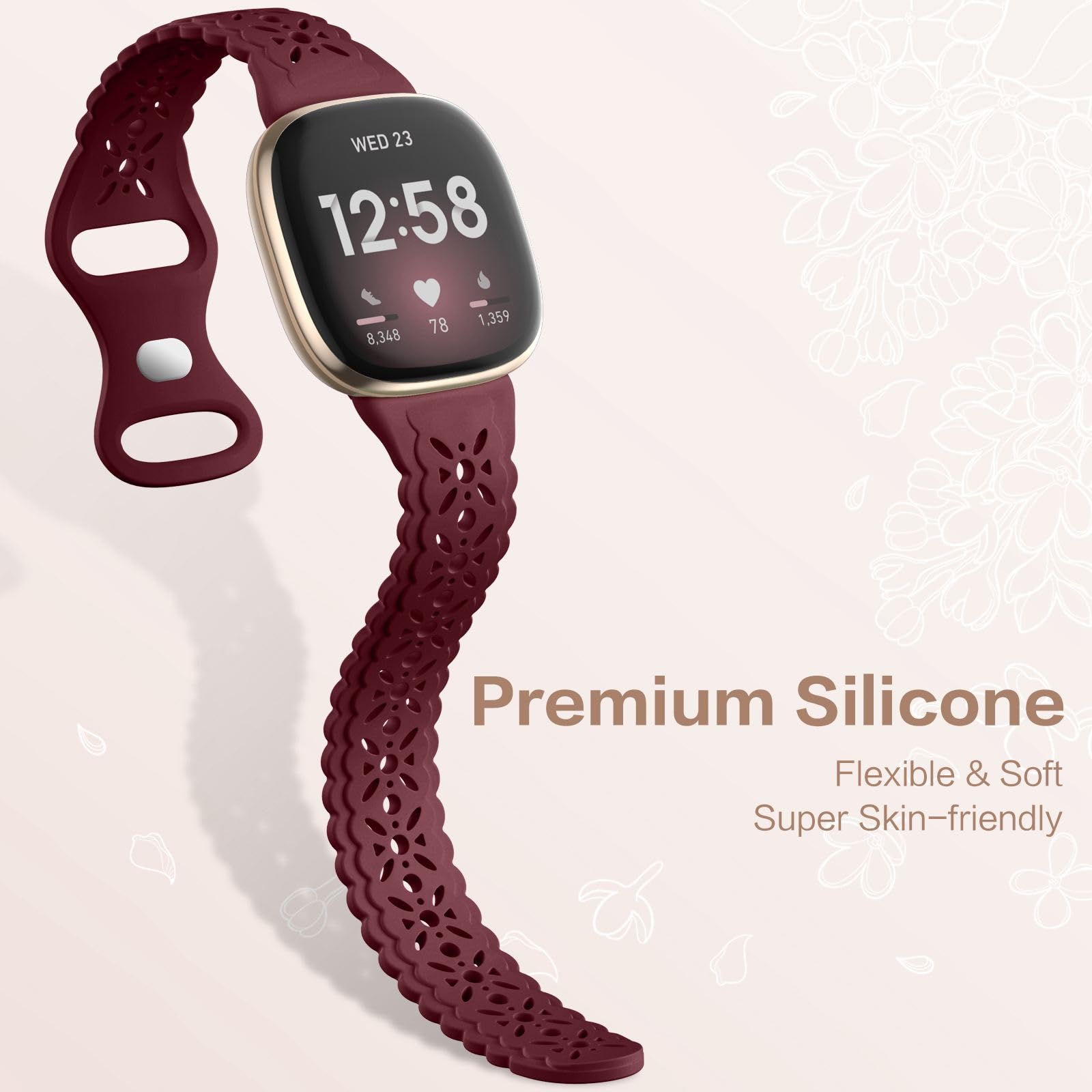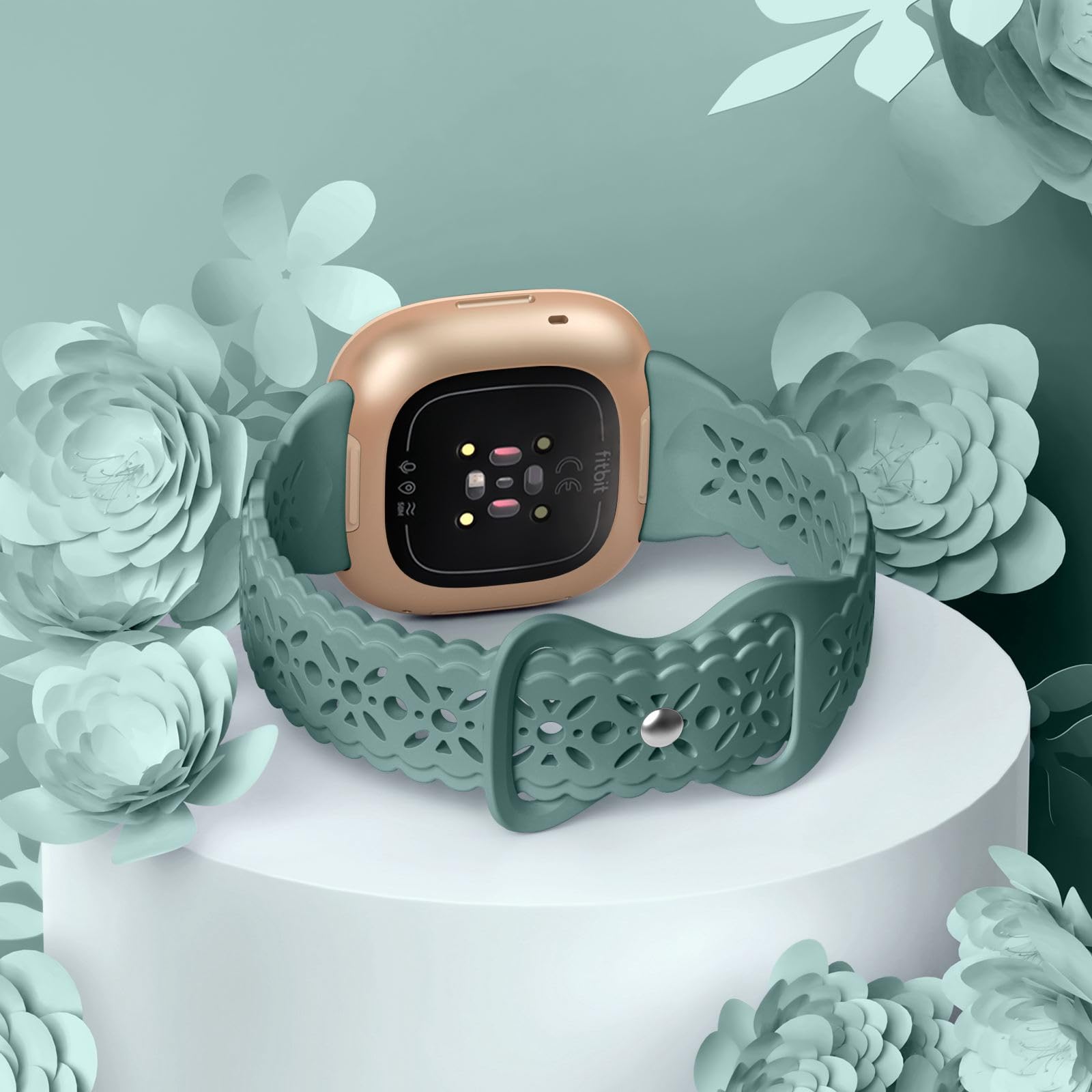 "Chic Floral Lace Hollow-out Design: Charlam replacement bands compatible with Fitbit Versa 3 band feature a unique floral lace hollow-out design that adds a touch of feminine sophistication, elegance, and fashion to your Fitbit smartwatch. Each petal has been carefully crafted to ensure a perfect blend of texture and aesthetics. The delicate floral shapes set it apart from solid silicone bands, giving it a pretty and cool look.