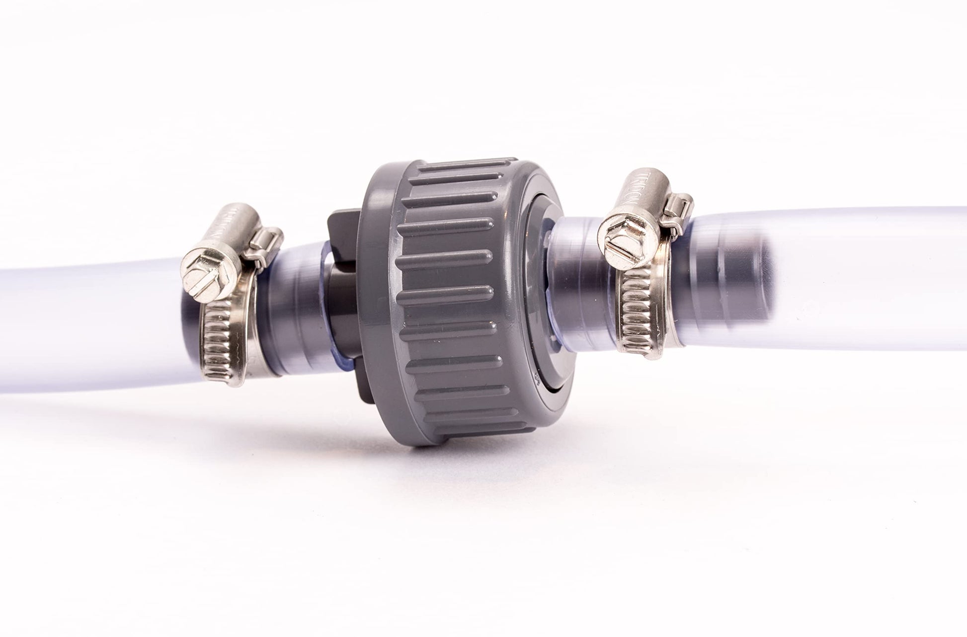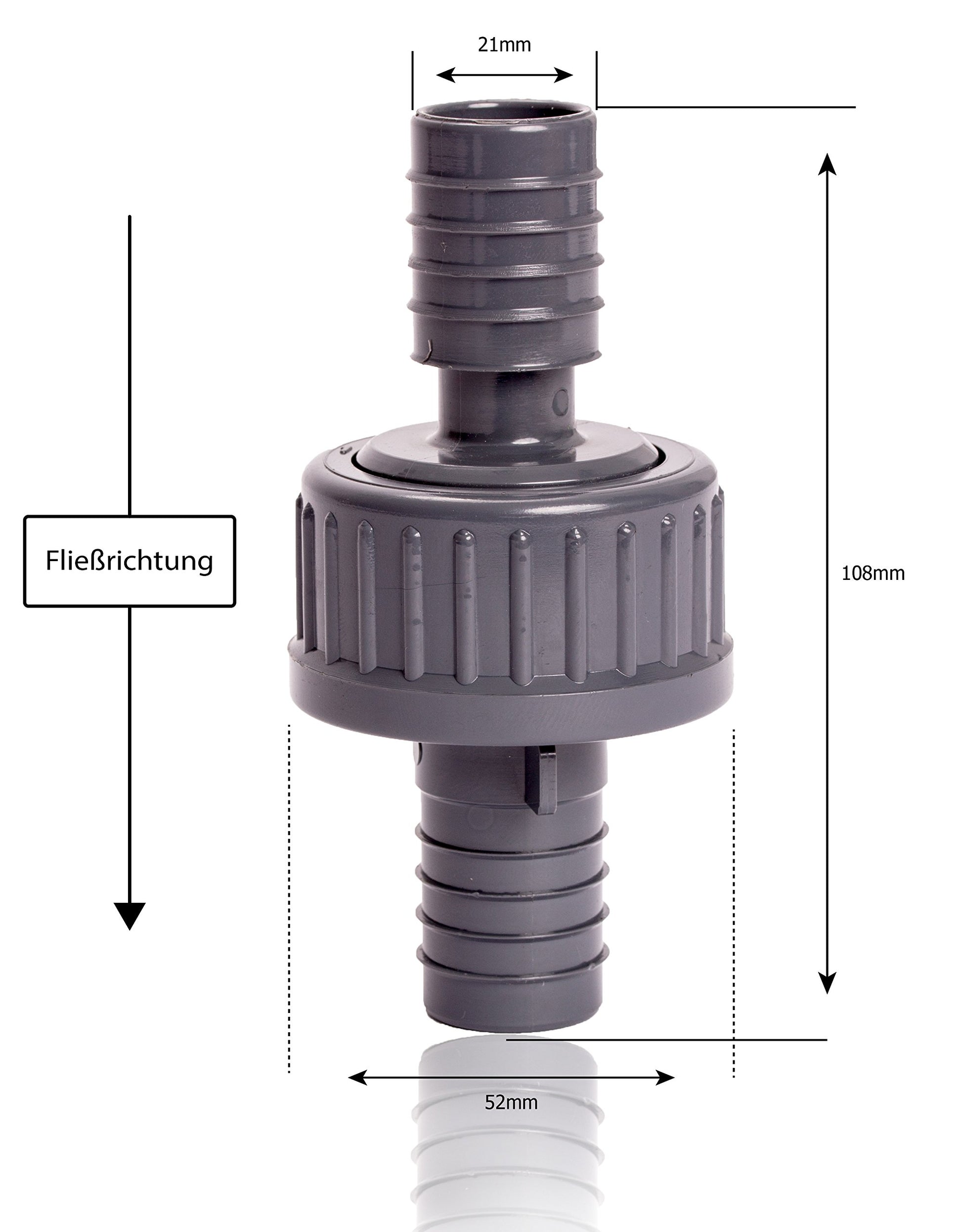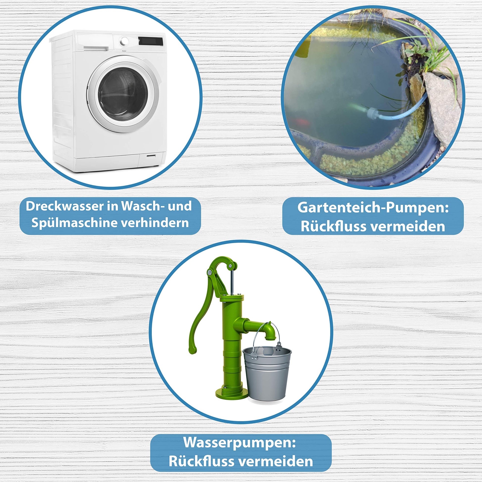["QUALITY - high-quality PVC check valve with 21mm hose tails for air and water applications", "COMPLETE SET - The valve comes with 2 matching hose clamps (16-27mm clamping range) ready for installation", "PRECISE FIT - The check valve fits perfectly for standard wastewater hoses of washing machines and dishwashers", "COMPLETE SOLUTION - Never again dirty wastewater in the washing machine", "EASY CLEANING - The 21mm check valve can be easily unscrewed and the membrane cleaned"]