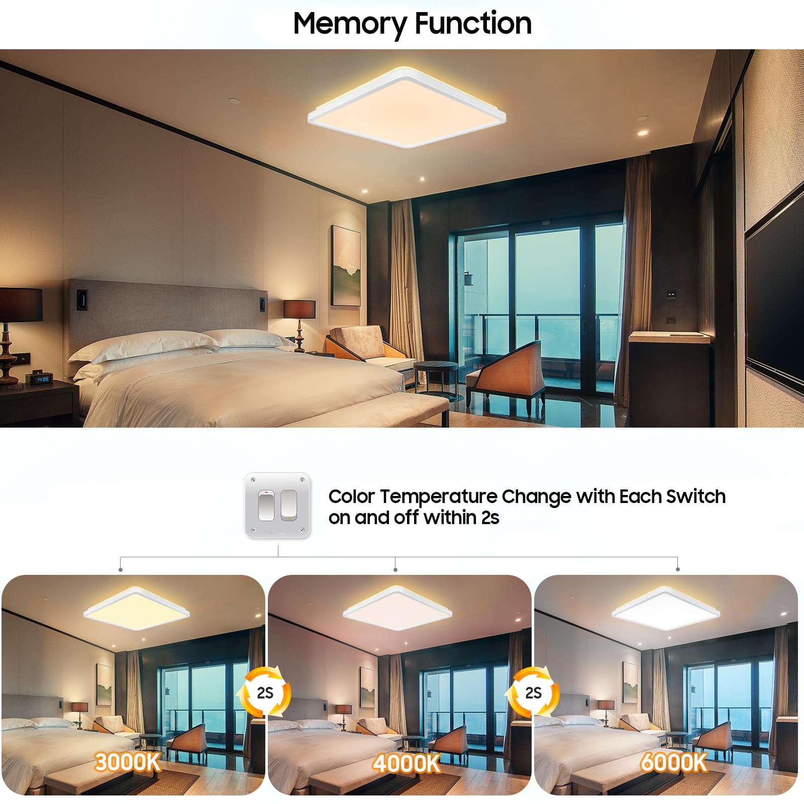 "【Memory Function】The dimmable LED ceiling light has a light memory function. Press the memory button on the remote control of the LED ceiling light to save your preferred settings without having to adjust them every time.",