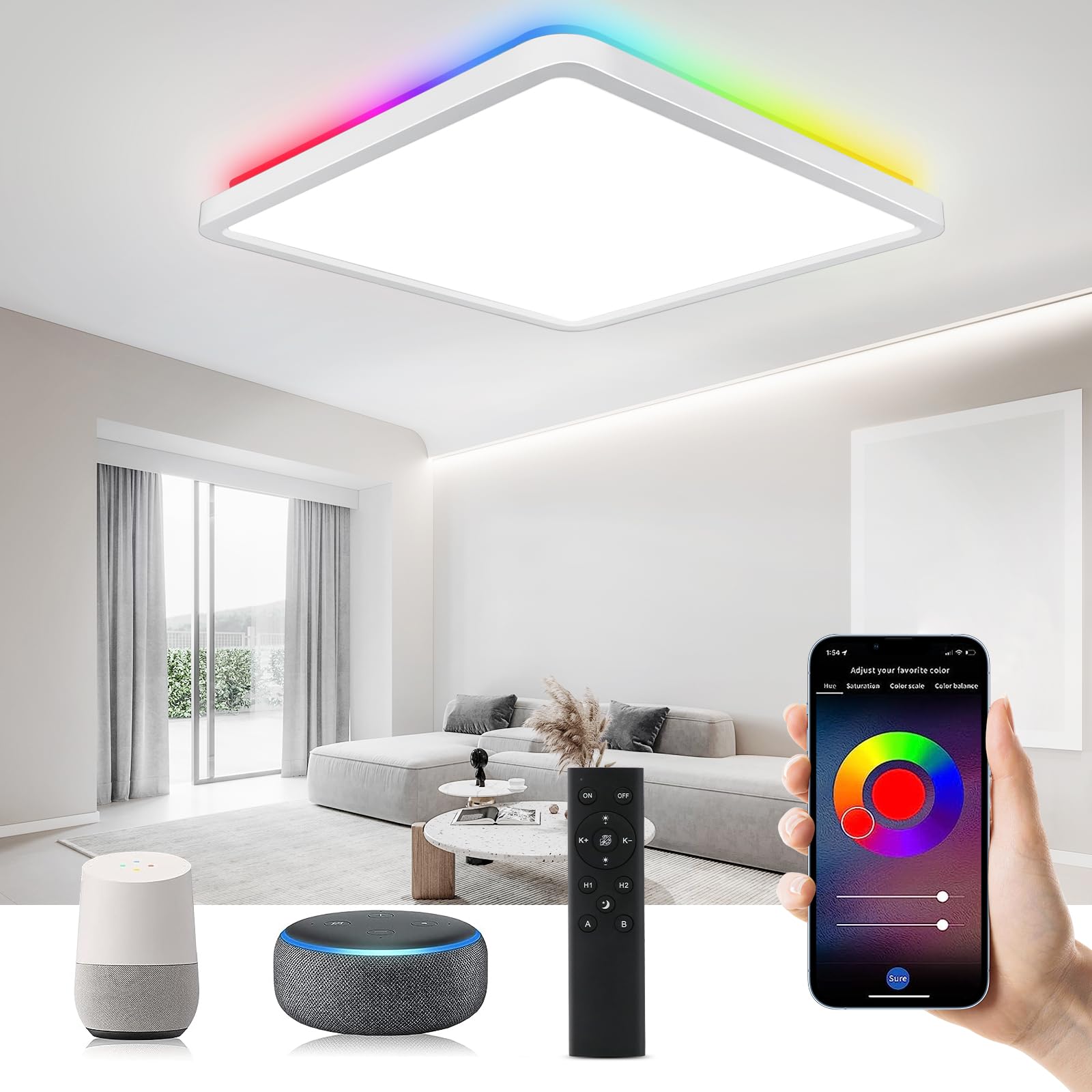 "【RGB Color Change and Dimmable】There are 16 million colors to choose from to meet the needs of different situations. Dimmable brightness: The brightness can be adjusted from 10% to 100% and color temperatures from 2700K to 6500K. The smart LED ceiling light has 8 light modes (Reading, Working, Night, Leisure, etc.) and can even change color according to the rhythm of the music to give you more atmosphere.",
