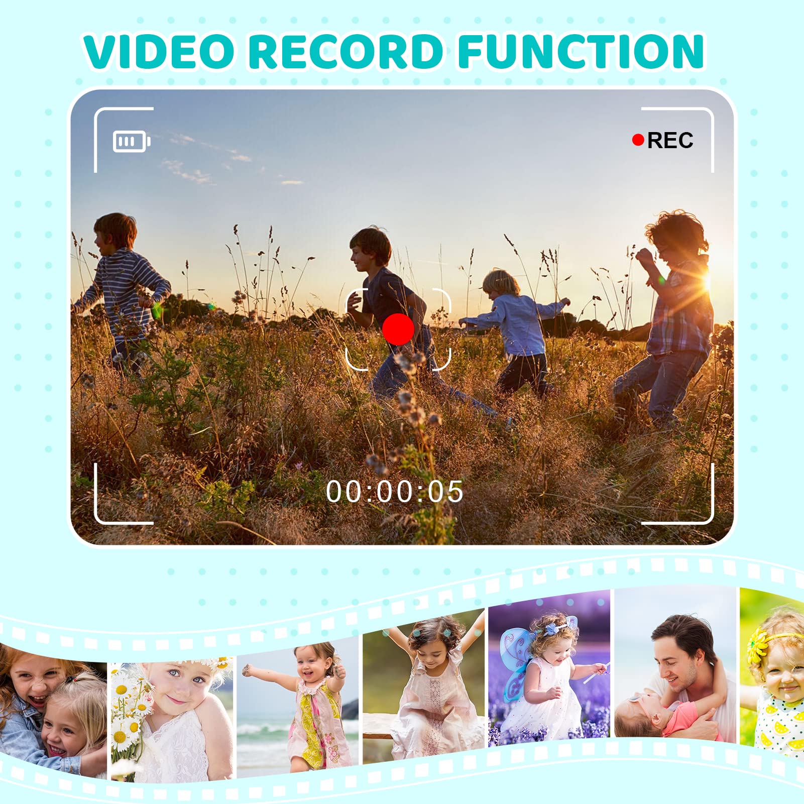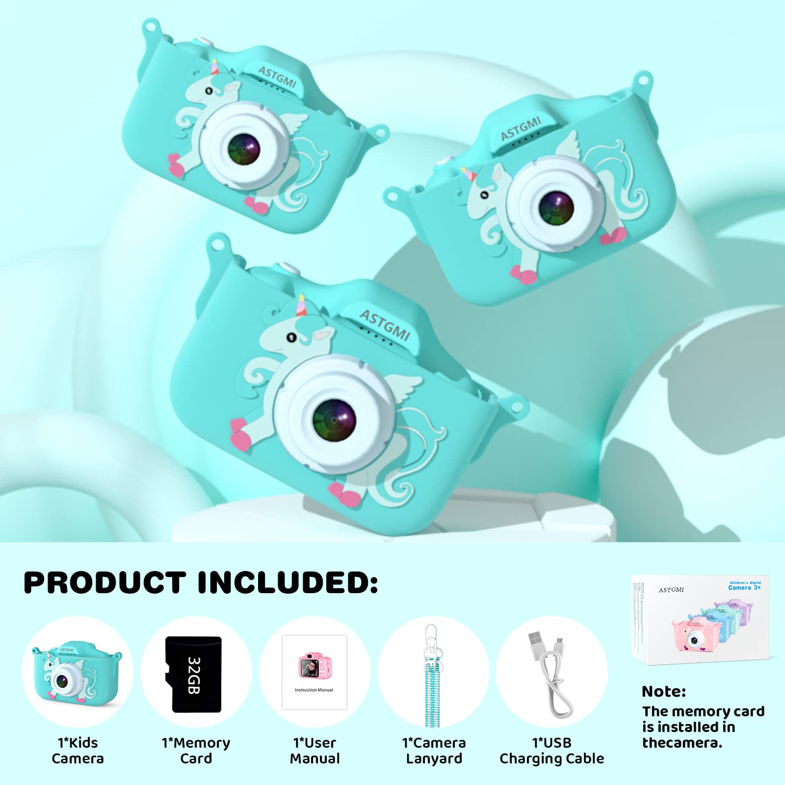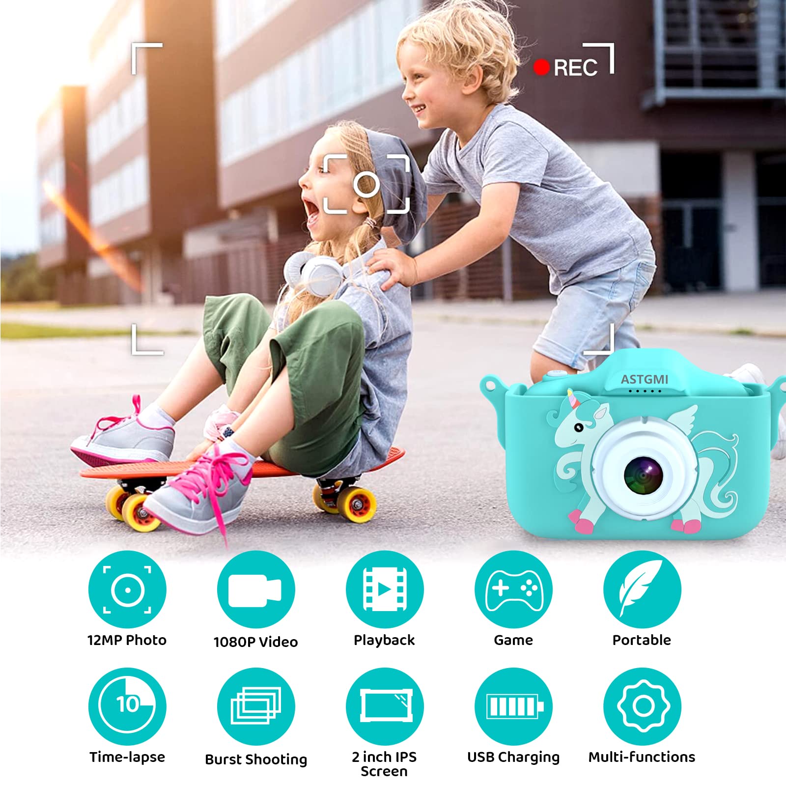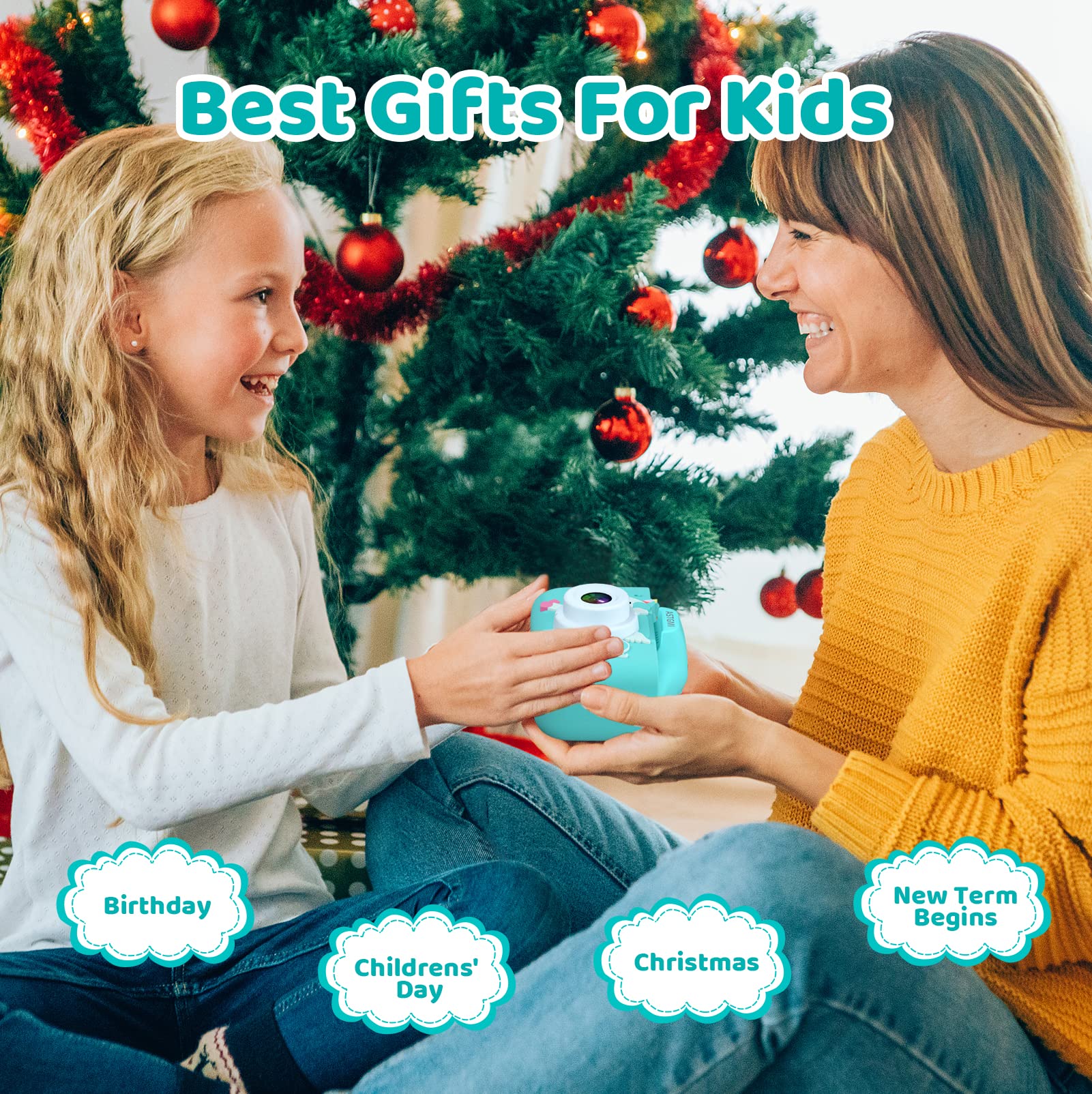["【1080P HD SCREEN】The kids digital camera is equipped with a 20-megapixel dual lens front and back and 1080P HD video recording, significantly improving photo definition. 2.0-inch HD IPS screen could protect your kids' vision, allowing them to explore the world with their eyes. Great Christmas gift for toddlers aged 3 4 5 6 7 8 9 10 11 12 years old!","【Multifunctional Kids Camera】This camera for kids has many functions such as photo taking, video recording, time-lapse recording, automatic shut-off, 24 cute funny cartoon frames, and various filter effects. Your kids can take their own photos; 5 puzzle games to bring more fun, develop their imagination, and enhance their intelligence!","【Safe Material and Portable Design】- This digital camera is made of environmentally friendly non-toxic materials and soft silicone material. The shockproof protective case is durable and safe for kids. It is small and lightweight with a very durable sling. Boys and girls can easily attach it around their neck to take it anywhere. No need to worry about this kids camera falling or getting lost","【Rechargeable Kids Camera】- Thanks to the built-in battery, this kids camera can be easily recharged via a USB cable with a computer or other devices. Charging time is approximately 2 hours and can take photos for 3-4 hours, so your child doesn't have to worry about the battery running out","【Best Gifts for Kids】This kids camera is the perfect gift for children's birthdays, New Year's, Christmas, Thanksgiving, and other special occasions. If you have any questions, feel free to contact us! A satisfactory solution will be provided according to the warranty policy!"]