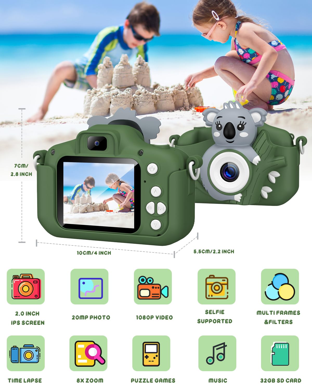 ["【2023 New Design Kids Camera】This children's digital camera features two cameras (front/back lens with 20 million pixels), 1080P recording video, 2.0-inch HD IPS screen, and is equipped with autofocus and 8x digital zoom. Your kids can take photos, record videos, and play games. It supports selfie mode and multiple languages.","【Multifunctional Kids Camera】Can take interesting photos, record videos, and supports time-lapse. This kids camera has 28 cartoon photo frames, 6 photo filters, and 5 mirror effects. When not taking pictures, the digital camera for kids can also play games and listen to music, providing more educational incentives and interactive fun for children.","【Cartoon Koala Silicone Case】The koala silicone case of the camera for kids can train children's grip ability and effectively protect them from shocks or falls during use. A matching lanyard is included to allow children's hands to move freely, so that they can enjoy the joy of photography freely and happily while playing, while preventing the camera from getting lost.","【32GB Card and 1000mAh Battery】Each kids camera comes with a 32GB card (already installed in the camera). Download the photos and videos to a computer using the included card reader and share them with family and friends. Use the USB data cable to charge the kids' digital camera, and it can work for about 3 hours on a full charge (varies depending on usage and other factors).","【Perfect Gift】Comes in a beautiful packaging and is the best gift for children's birthdays, Christmas, holidays, or festivals to improve the child's observation skills and develop their photographic potential. Suitable for children aged 3 to 12 years old. The package includes: 1x Kids Camera, 1x 32GB Card, 1x Card Reader, 2x Lanyard, 1x USB Cable, 1x Cartoon Sticker, 1x Reset Pin, 1x User Manual."]