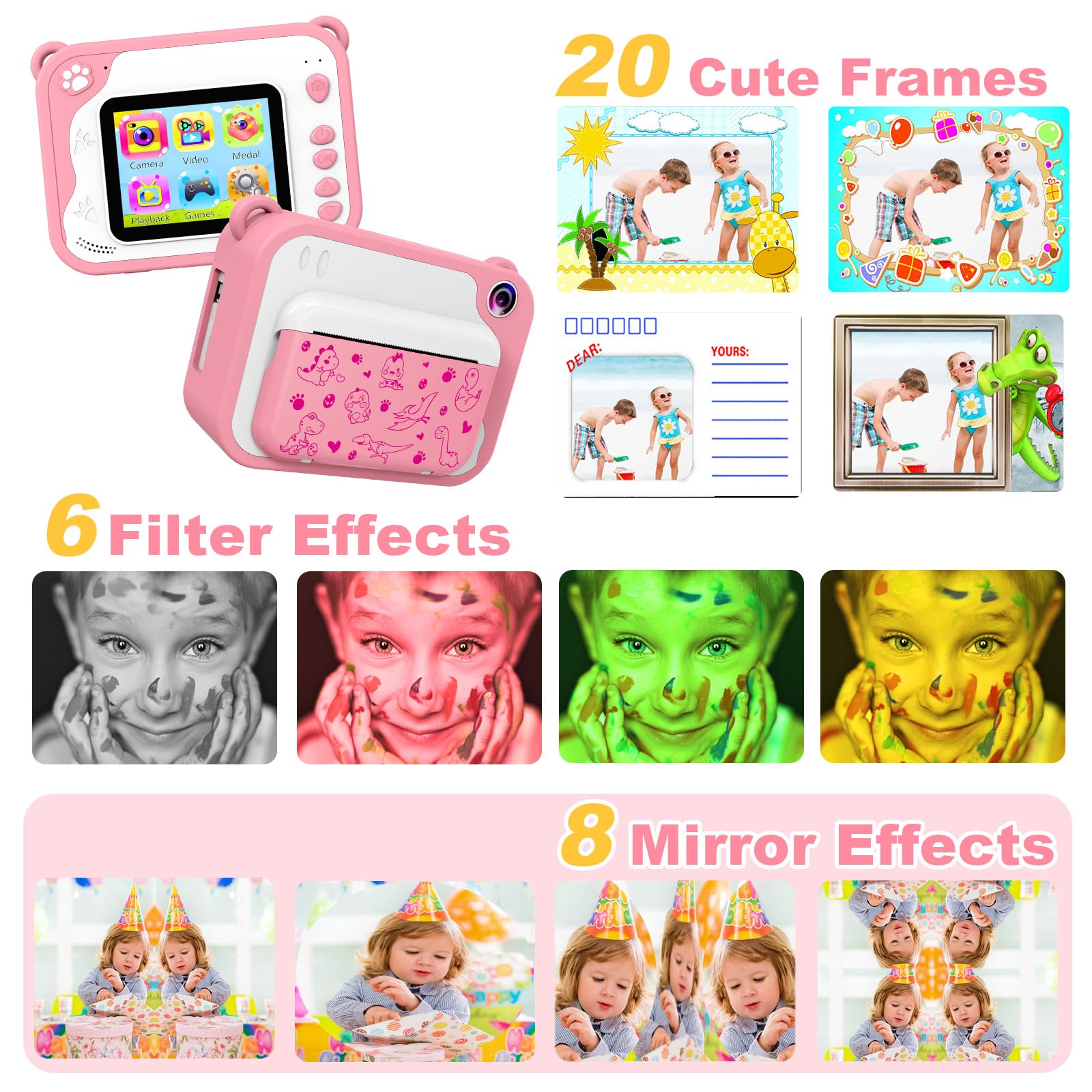 ["Children Camera Instant Cameras】Instant print camera. The printed photos are black and white. With the colored pencils we have given, you can create DIY photos and stimulate children's creativity. 12 megapixels and 1080p HD video, 2.0 inch IPS screen. The children's camera supports original photo shooting, video recording, playback, burst shooting, 4 classic filters, 8 special effects, 17 cute cartoon frames, 10 languages available.