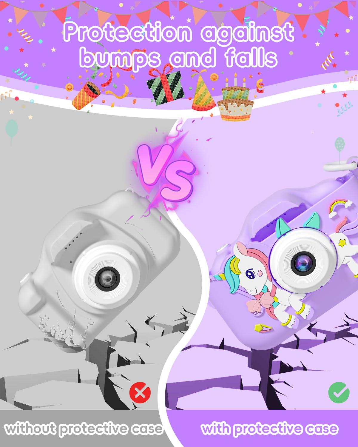 ["New Design - The cute silicone soft case of the digital camera for kids can train children's gripping ability and effectively prevent children from being bumped and damaged during use. Equipped with a same-colored lanyard, it frees the hands of children, allowing them to enjoy the fun of photography while playing freely.","MULTIFUNCTIONAL KIDS CAMERA - It can simultaneously capture interesting photos and videos. When not taking photos, kids can also play small games, listen to music, and relax. It can set the time stamp and timing of the recording, capturing every memorable moment. Use the Type-C data cable to connect the camera to the computer. You can preserve the beautiful memories of children and share them with family and friends.","Easy and simple to use - the camera for kids features retro pixel design, the up and down buttons switch the filter and photo frame or zoom, and the right button switches the selfie mode to meet the different shooting needs of young photographers. The digital camera has 28 photo frames and 6 filters, capturing beautiful moments and taking various fun and interesting photos, providing children with more interactive fun.","Type-C charging and large memory card - Use the Type-C data cable to charge the kids camera, and it can work for about 3 hours on full charge. Kids can capture all kinds of wonderful moments at will and don't have to worry about storage issues, as we provide a 32GB memory card that can store thousands of photos!","Ideal holiday gift - Birthday, Christmas, and holiday gift for boys and girls aged 3-12. What you get: 1 kids camera, 1 Type-C charging cable, 1 cartoon protective case, 1 32GB memory card, 1 carrying strap, 1 user manual. If you need assistance with our products, feel free to contact us. Please use an adapter with less than 5.2V or a laptop socket to charge."]