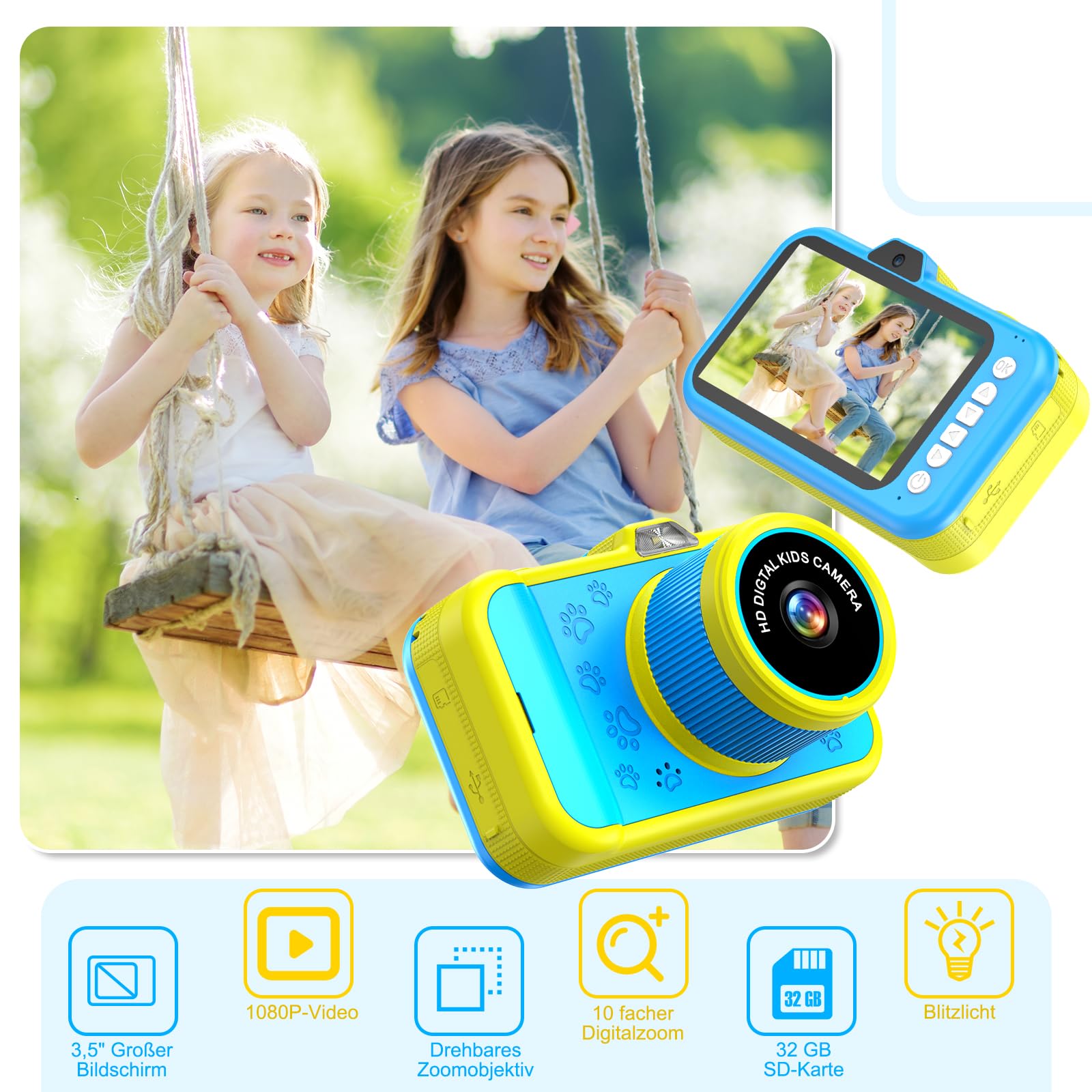 ["📸🎁【Kids Camera with 360° Rotation Zoom】With this newly developed kids camera, your child can experience what it's like to be a little photographer. It features a zoom lens that can rotate 360°. By rotating the camera lens, more details can be captured with the 10x zoom. The large 3.5-inch IPS HD display offers better viewing angles and a wider color range. The HD lens (with selfie support) and 1080P HD videos ensure sharp, clear images.","📸🎁【Multifunctional Kids Photo Camera】With 30 cartoon frames, 4 color filters, and 8 mirror effects, this kids camera meets children's different photographic needs. It also has 5 built-in puzzles, an MP3 player, 10x zoom, self-timer and time-lapse functions, as well as a built-in flash for dark shots. The many functions ensure that children will have a lot of fun taking pictures.","📸🎁【USB Charging and 32GB Memory Card】This kids camera has a built-in 1200mAh battery and a Type-C interface, providing more convenience for children. It can support 3-4 hours of use after a full charge. Compatible with computers and portable chargers with USB output. The digital camera for kids comes with a 32GB TF card that can store thousands of photos, so you don't have to worry about running out of storage space.","📸🎁【Easy to Use and Portable for Kids】This compact and lightweight digital kids camera is specially designed for children. With only 7 buttons to operate, it is convenient for kids to take photos and videos. The included lanyard is very easy to carry, allowing kids to play and record their lives anywhere. It is the perfect gift for boys and girls aged 3-12 years old.","📸🎁【The Perfect Gift for Kids】This baby camera toy is fully functional and an ideal gift for birthdays, Christmas, or other occasions. It not only provides entertainment but also promotes the development of children's photographic skills and creativity. This gift can help them capture the precious moments in their lives and is a fun and educational gift. Suitable for children aged 3-12 years."]