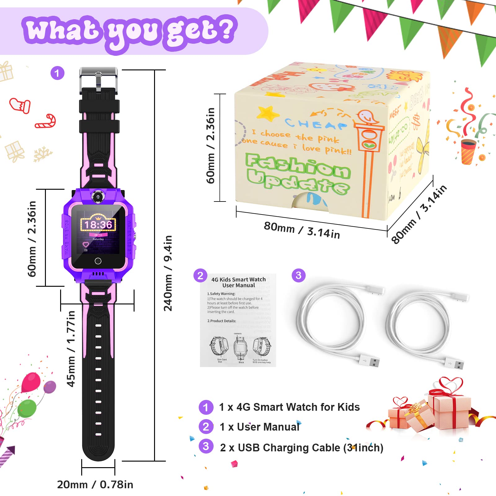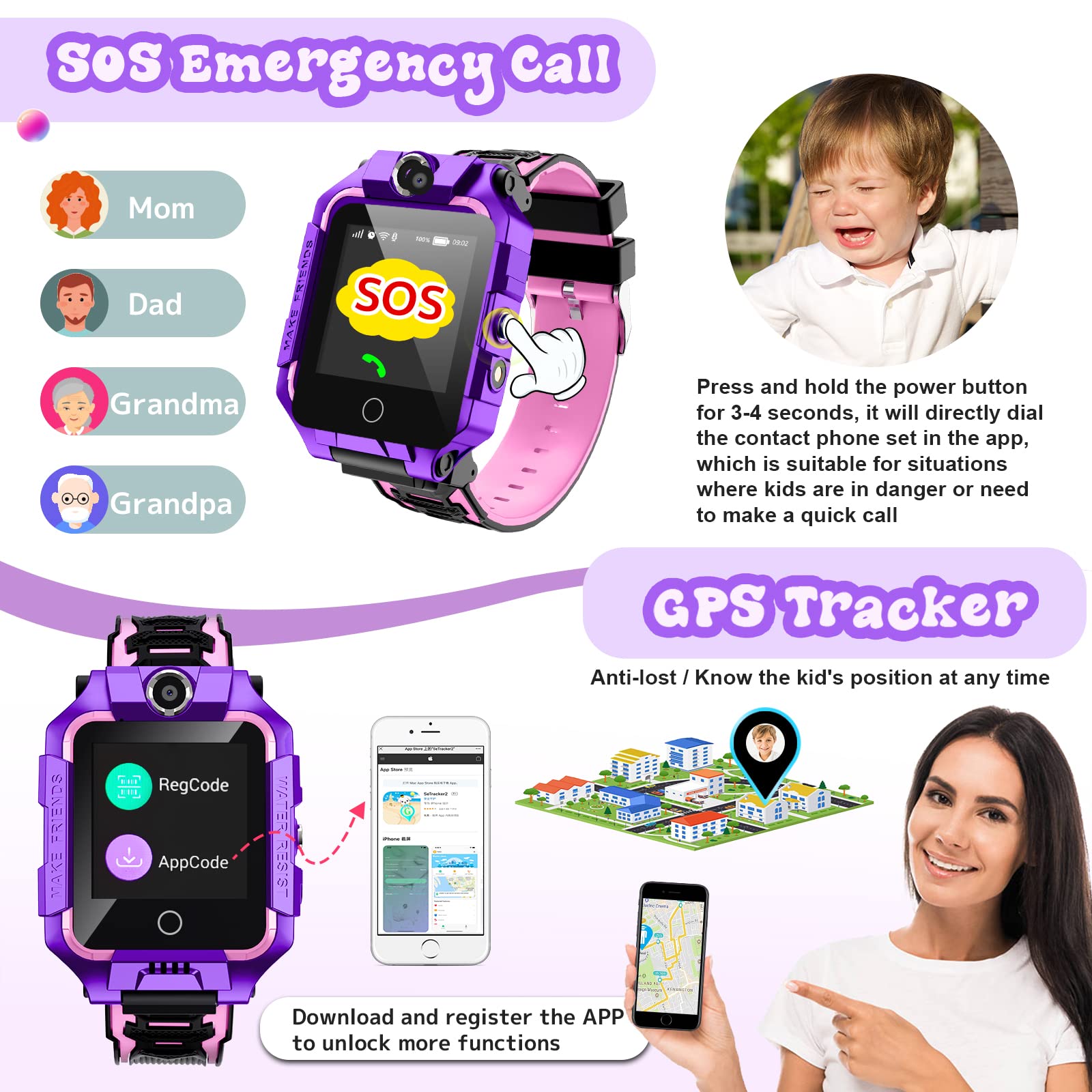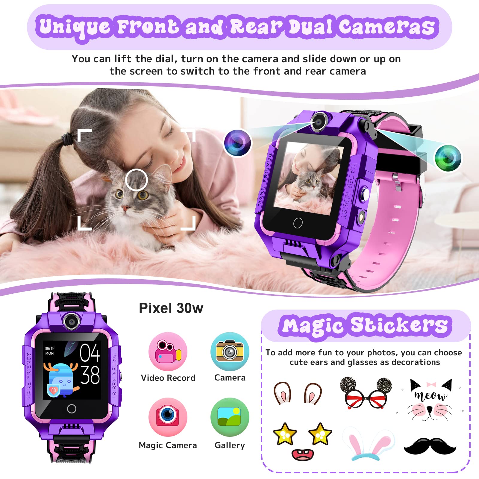 ["Unique lift-up dial and 4G network supported】This kids smartwatch is designed with a unique 360° rotating dial and it will be the coolest smartwatch for kids with front and rear cameras. This kids watch features a smooth 4G network for kids to make and receive calls, texts, etc. Parents can check the child's status anytime through app tracking (messages, video calls, GPS). We recommend O2, Vodafone, EE, and 3 (three), SIM card not included. Please check the network coverage around you first.","【Two-way communication & 👨♀ SOS & GPS safety care】The kids watches are integrated with 3 types of two-way communication: 1. Call 2. Video call 3. Group chat And parents can preset 3 phone numbers on the app phone book to realize the SOS function by pressing the power button of the kids smartwatch for 3 seconds. To confirm GPS location on the app when your girls or boys are in danger, you can help them immediately. This is not only an interesting children's GPS watch, but also a protection for children","【 ✅ HD Full Touchscreen & App Store System】This GPS tracker kids watch features a full touchscreen that makes it easier for you to operate this kids smartwatch. You can check the signal, battery power, and time by swiping down the screen. And the high-quality HD screen and adjustable brightness ensure that children's eyes are minimized. This child-safe smartwatch comes with its own app store. You can download more watch apps by connecting the 4G smartwatch for kids to your Wi-Fi network","【💡More features】If you don't insert a SIM card or connect to the app. This kids tracker watch still supports some functions such as Magic Camera, Flashlight, Gallery, Bluetooth, Stopwatch, Math Games, etc. But we still recommend connecting to the app and equipping with a SIM card to access more functions like call, video call, messages, SOS, phone book, alarm clock, do not disturb, pedometer, calendar, for a better experience. Waterproof and multiple languages are perfect for kids, girls, boys, students","【💝Perfect gift choice & Satisfying service】This kids mobile watch is a lifesaver when you worry about your child's location or status. If you want to prepare gifts for Christmas or birthday, you should get the smartwatch for kids. We offer 24 months limited warranty and a lifetime enthusiastic after-sales service. If you are not completely satisfied with your purchase for any reason, please do not hesitate to contact us by email, we will solve the problem for you within 24 hours."]
