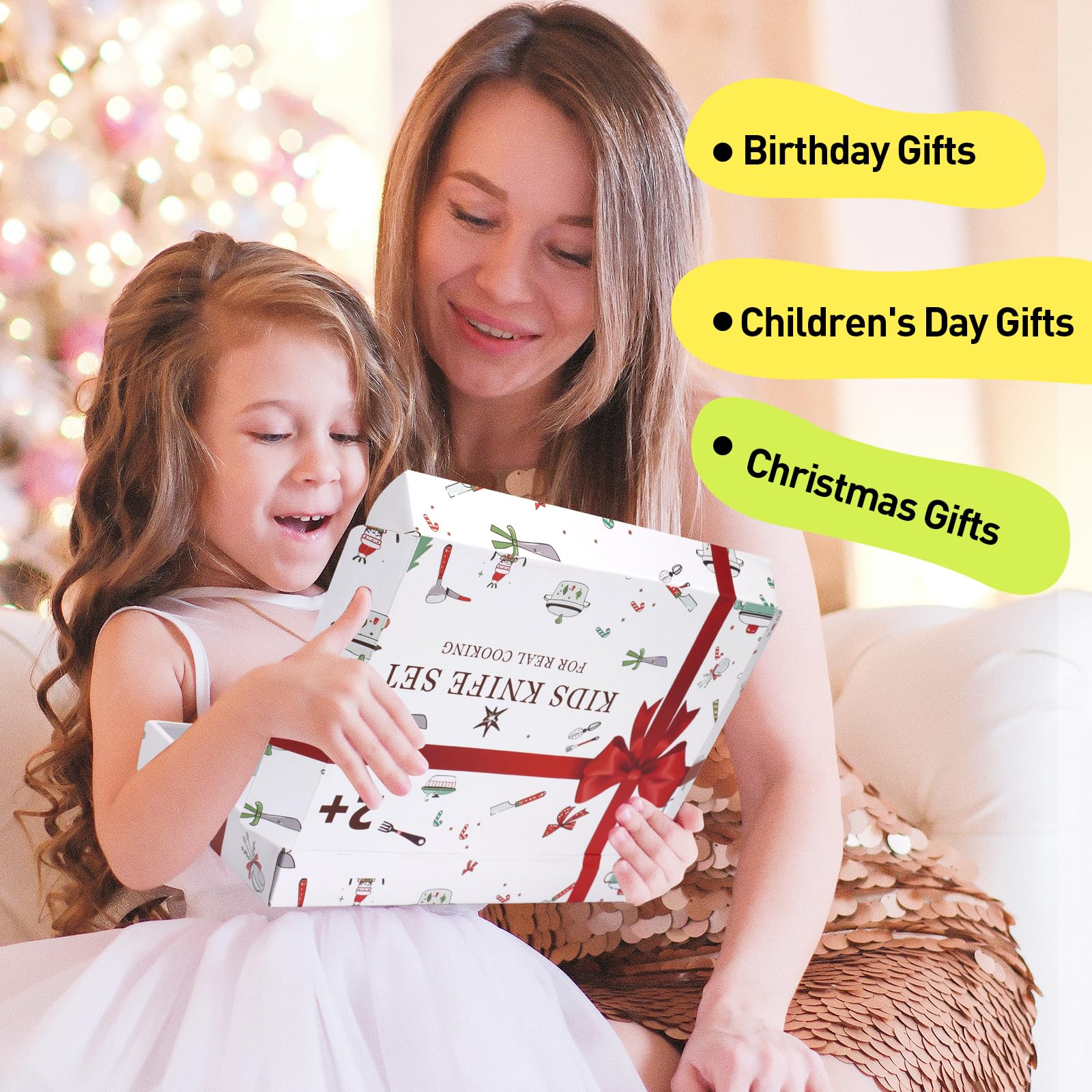["What's included in the set"] You will receive 1 piece of wooden children's knife, 1 large sandwich cutter, 4 * dinosaur cookie cutters, 4 pieces of children's knives with serrated edges in different sizes/colors, 4 * fruit cutter shapes, 1 * cake cutter, 1 * Y-peeler, 1 * cutting board, 1 * wooden stick, 1 * egg beater, 1 * storage bag, etc. A variety of toddler knives can increase the fun of children's kitchen play.["Durable and safe material"] The children's knives for real cooking are made of wood and high-quality food-grade polypropylene. The potato cutting knife for children is made of high-quality stainless steel and PP material. These children's knives are non-toxic, BPA-free materials, safe to use, exquisite workmanship, not easy to break and deform. Our salad knife set offers you a good user experience.["Ergonomic design"] The wooden children's knife has an integrated handle design, the child's strength can be fully applied to the blade, which is safe and labor-saving. The slim design of the handle makes the grip comfortable and light.["Ability training"] The child-safe knives are specially designed for toddlers, children can cook in the kitchen with their mother, make your children more participatory, train the children's hand-eye coordination and improve perception.["Multifunction"] Wooden children's kitchen tools can easily cut various types of vegetables, fruits, cheese, and other foods that are suitable for children to learn cutting. These children's knives can be used in many occasions, such as family celebrations, picnics, birthday parties, parent-child activities, etc., and add charm to these occasions.