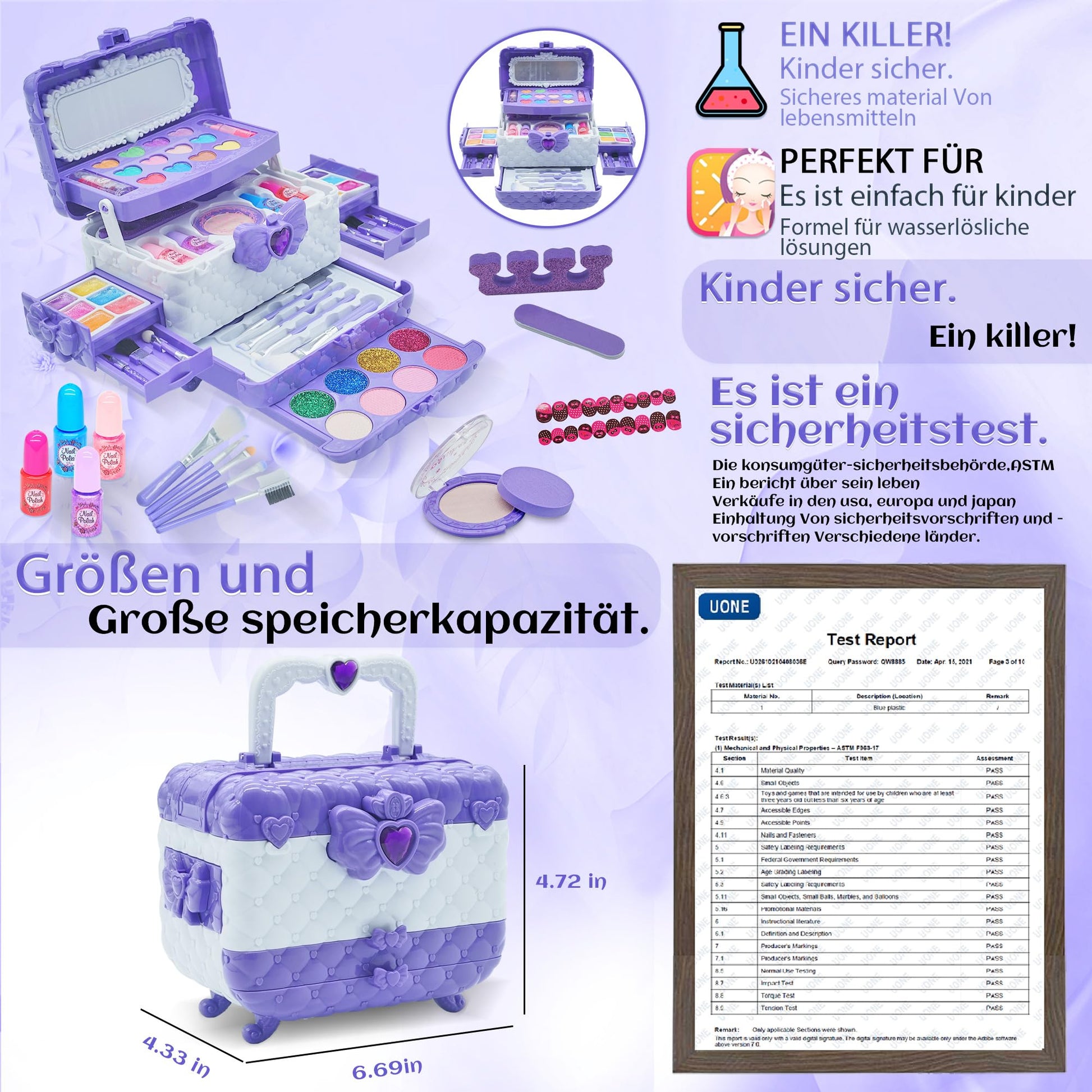 🍇【Safe for Children Washable Makeup Kit Girls】Our children's makeup sets are made of safe, water-soluble materials, makeup kit for girls that can be washed off with soap and water, do not irritate, and are perfect for children's skin. No matter if she carefully applies the makeup or just has fun painting colors on her entire face, parents rely on the gentle ingredients of this kit.",
