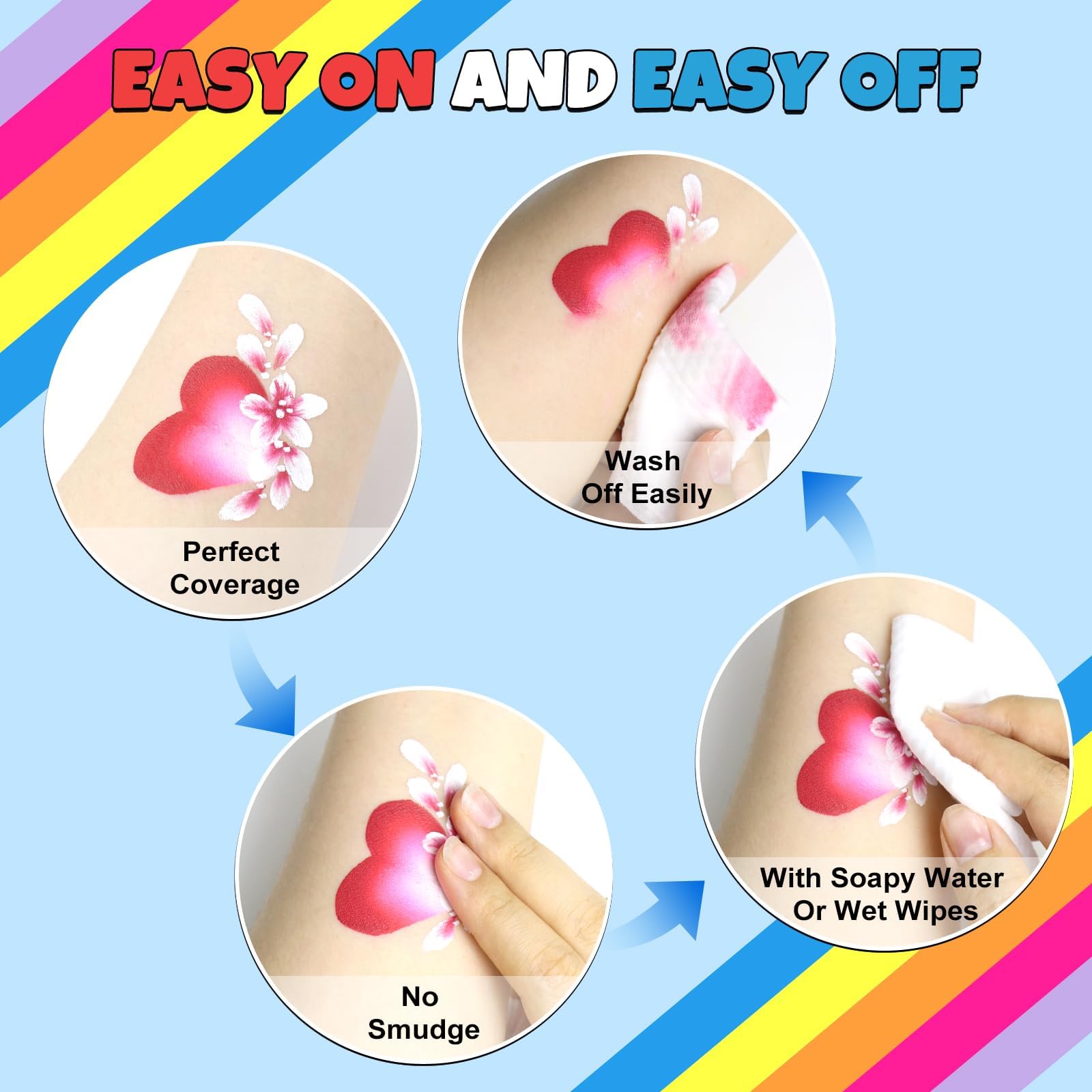 ["【Face Paint】: You will receive a split cake palette face paint kit for kids, a set of 4 professional brushes, 5 sheets of face paint stencils, and 2 sponges. You no longer have to worry about not having enough basic colors. This makeup set covers all your makeup needs.","【Split Cake Palette】: The professional quality split cakes makeup set for Halloween can help you create unique designs such as butterflies, flora, fairy floss. You can mix colors through creativity to create different special patterns. The face paint set is perfect for all aspects of face and body painting.","【Safe Material】: This carnival makeup for kids is made of safe materials, natural and non-toxic. The kids carnival makeup is hypoallergenic, skin-friendly, causes no itching or irritation, safe and gentle on sensitive skin, suitable for both children and adults. This carnival makeup is water-based. Since every skin is different, we recommend a small skin test before use.","【Easy to Use and Clean】: This is a very easy to use and clean carnival makeup. The kids theater makeup is water-soluble, simply add a few drops of water to the desired kids makeup set for girls and then apply lightly to the skin with a brush. The Halloween makeup for kids dries quickly and can be easily removed with soap, warm water, or a damp cloth.","【Wide Application】: This makeup set for girls is not only suitable for the face, but also for other parts of the body such as hands, arms, or legs. With this face painting kit for kids, you can paint your face and your child's face as cute animals, fairy princesses, or superheroes and more. This Halloween makeup set is perfect for Halloween, birthday parties, costume parties, carnivals, stage shows, painting classes, and more."]