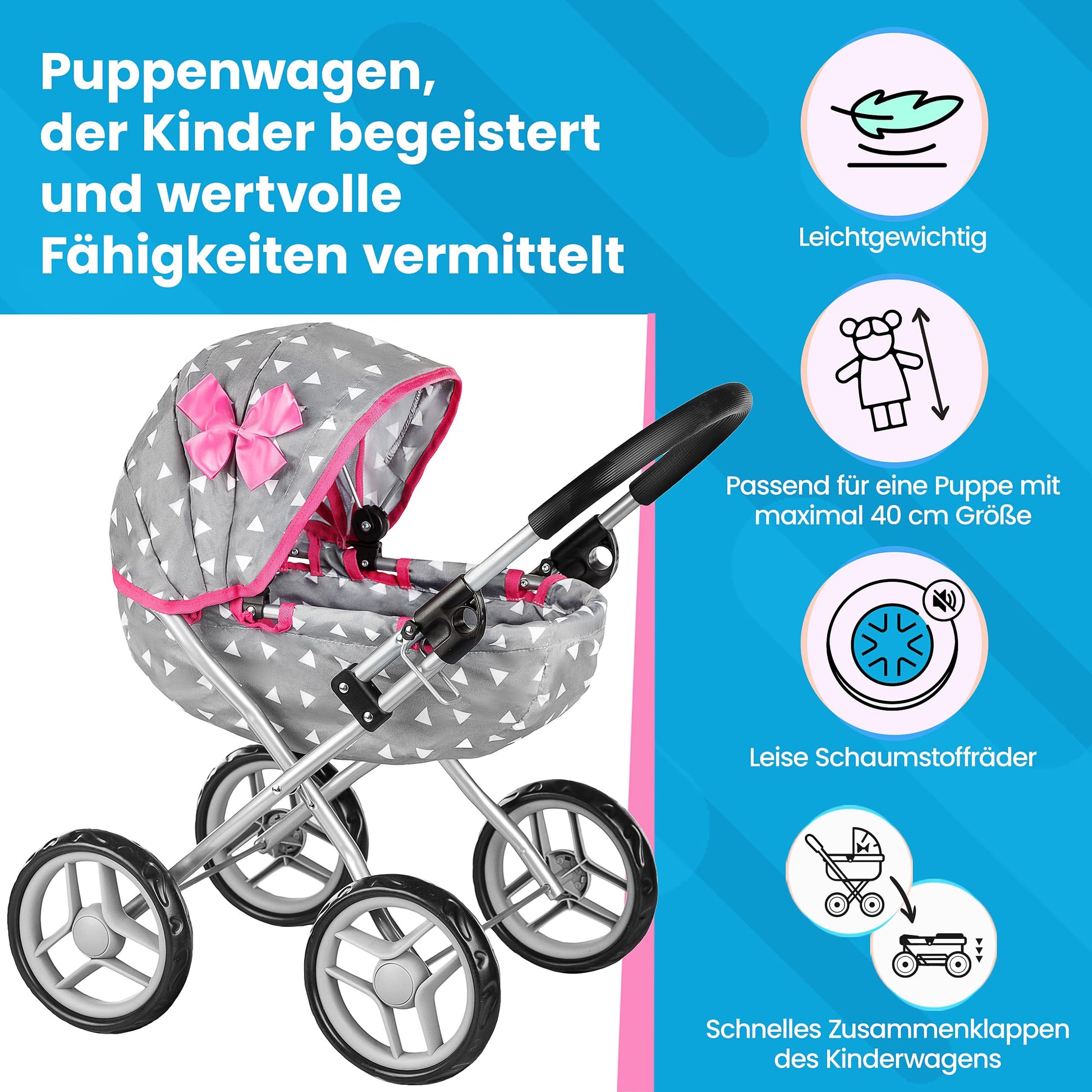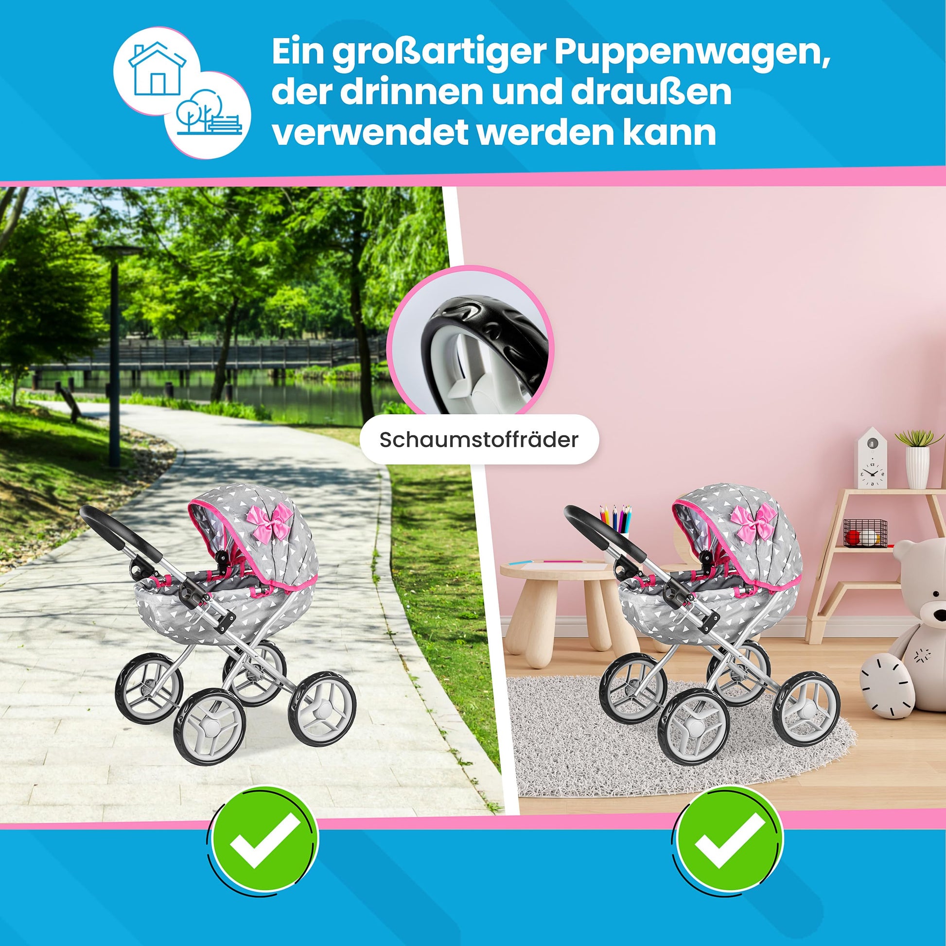 ["ULTRA LIGHT & STABLE => Robust aluminum frame at only 2.9 lbs ensures smooth pushing and good stability - perfect for daily play.","WHISPER QUIET TIRES => Foam rubber wheels run quietly and gently on the floor - perfect for indoors and walks in the park.","COMPACTLY FOLDABLE => Quick folding for space-saving storage and easy transport - ideal for travel and outings.","SECURE DOLL COMFORT => Safety belt and deep seat provide support; suitable for dolls up to 16 in (e.g. Baby Born, Baby Annabell).","EASY-CARE FABRICS => Removable covers machine washable at 86°F; with convenient shopping basket and adjustable canopy. Recommended for ages 3 and up, handle height 21.3 in."]
