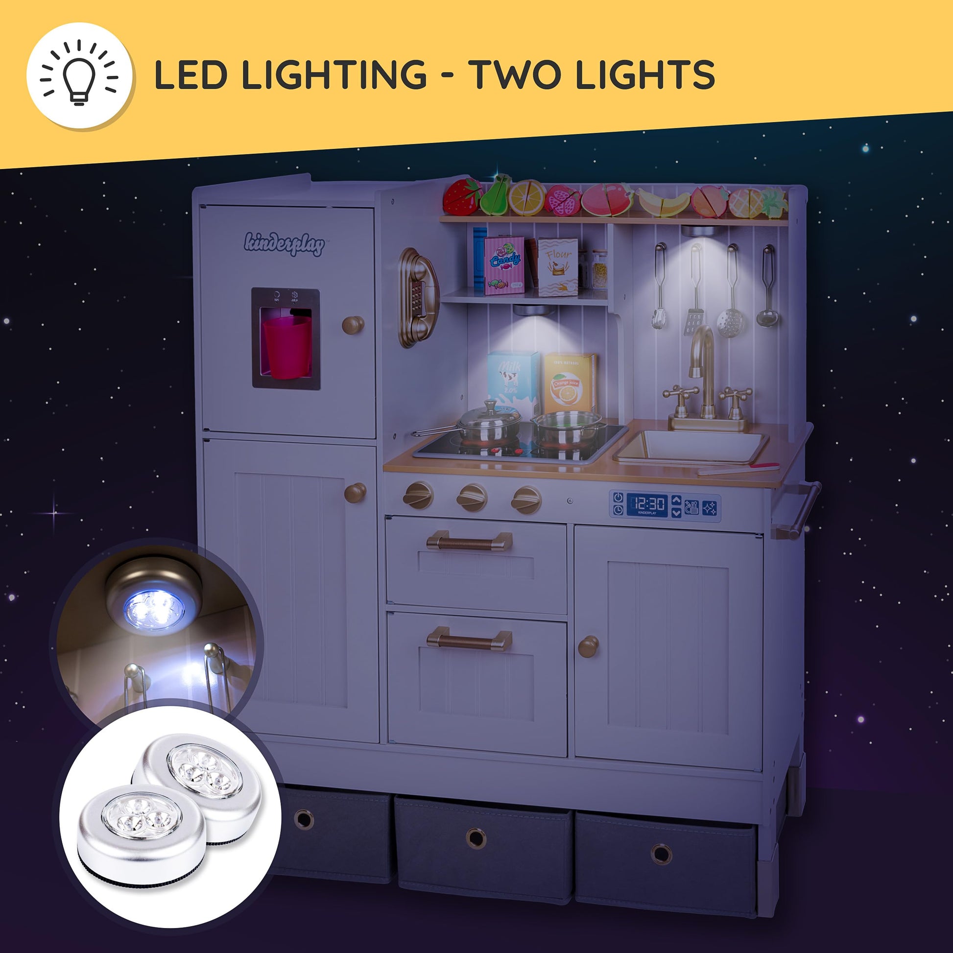 "REALISTIC COOKING EXPERIENCE => Interactive induction hob with light & sound (15 s), two LED spots and water dispenser with sound ensure authentic role-playing. Power supply: hob 2×AA, dispenser 2×AAA, each LED 3×AAA (batteries not included)."