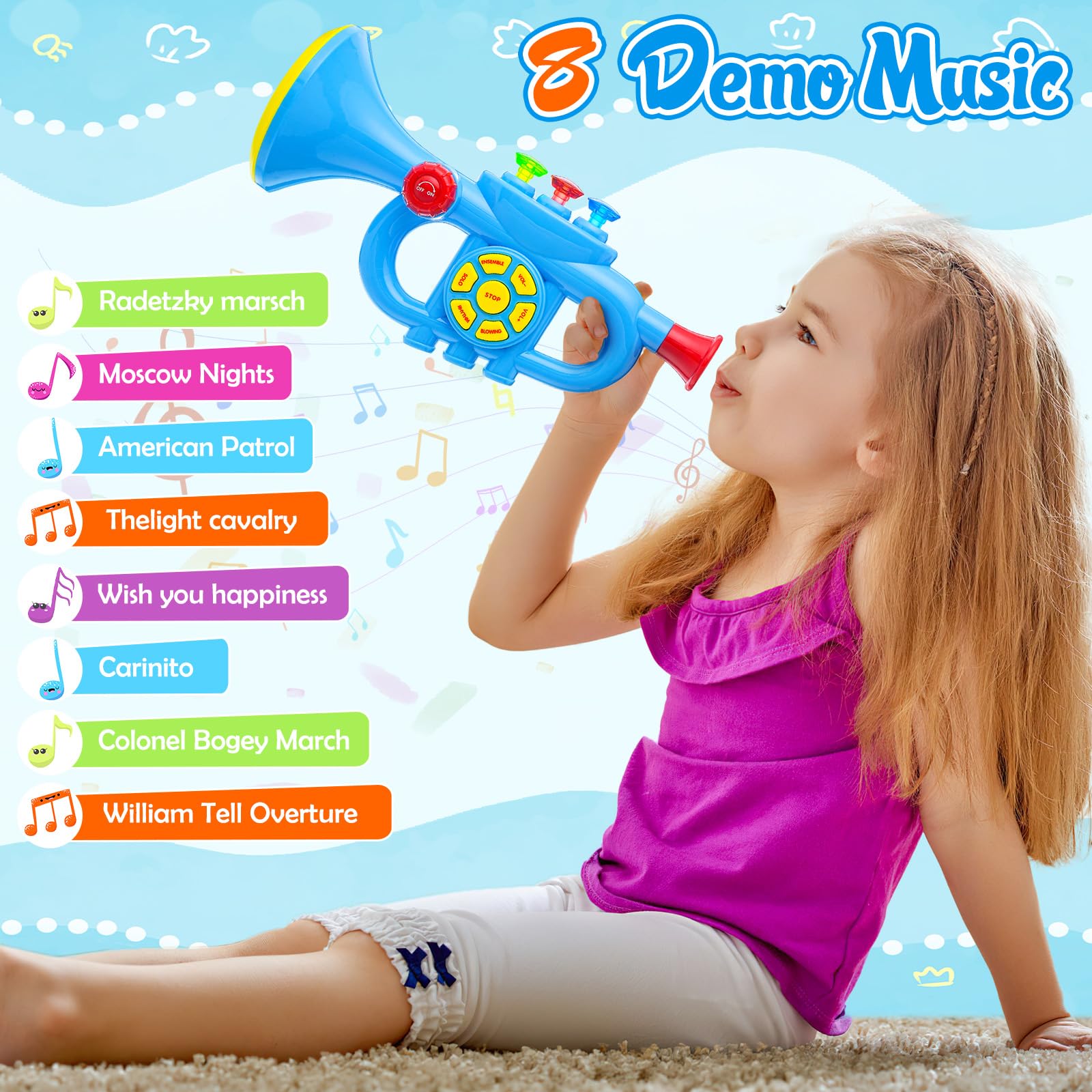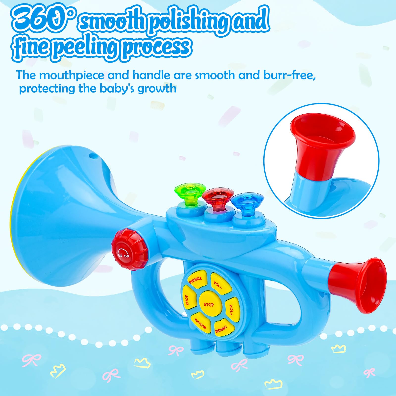 ["【Multifunctional Musical Instrument】The children's trumpet is equipped with three musical keys on the top, providing real music simulation function. With the mouthpiece and play button, you can play a high-quality and clear trumpet sound, just like a real trumpet. This musical toy includes 8 blowing modes, 8 rhythms, 8 solos, and 8 ensembles. So your child has unlimited space to perform and improve their self-confidence.","【Safe ABS Material】This mini trumpet toy made of safe ABS material is sturdy and impact-resistant, environmentally friendly and odorless, reliable and safe, stable and not easy to break. It is safe and reliable for toddlers and very suitable for children. As long as you store it properly, you can play with it for a long time.","【Learning Musical Instruments】Children's flute has four playing methods: blowing, solo, ensemble, and rhythm, which can enhance the sense of music and promote musical talent. With flashing effect: With a push of a button, it lights up, sparking your baby's joy of play. As your baby blows and breathes, it learns to control its breathing, trains its mouth muscles and lung capacity, and promotes learning of pronunciation and breath regulation.","【Easy to Use】Before using musical instruments for toddlers, insert 3x1.5V AA batteries (not included). The mouthpiece is removable, so clean it before play to use it more hygienically. The musical instrument for children can adjust the desired volume, which protects the child's hearing very well. Let toddlers have endless fun and at the same time train the child's practical skills.","【Ideal Gift】Plastic musical instruments can help practice finger activities and develop music, color, emotions, creativity, imagination, and logical thinking. This is the perfect gift for music lovers. You can give it to your daughter or son as a birthday gift, Christmas gift, or Halloween gift. This small set is suitable for children aged 3 to 12 and comes in a pretty, colorful box"]