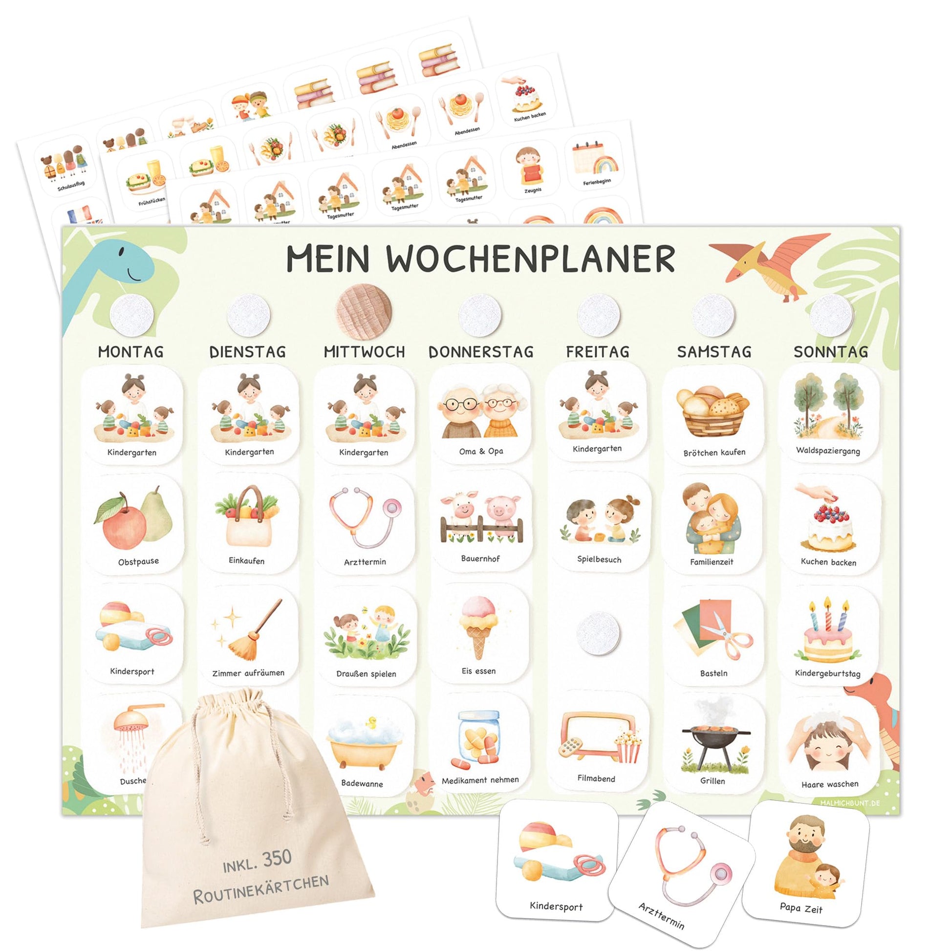 Children's weekly planner with Velcro dots in A4 format, Montessori daily schedule with 350 routine cards - visual routine planner for kids, family planner for more structure in everyday life (dino)
