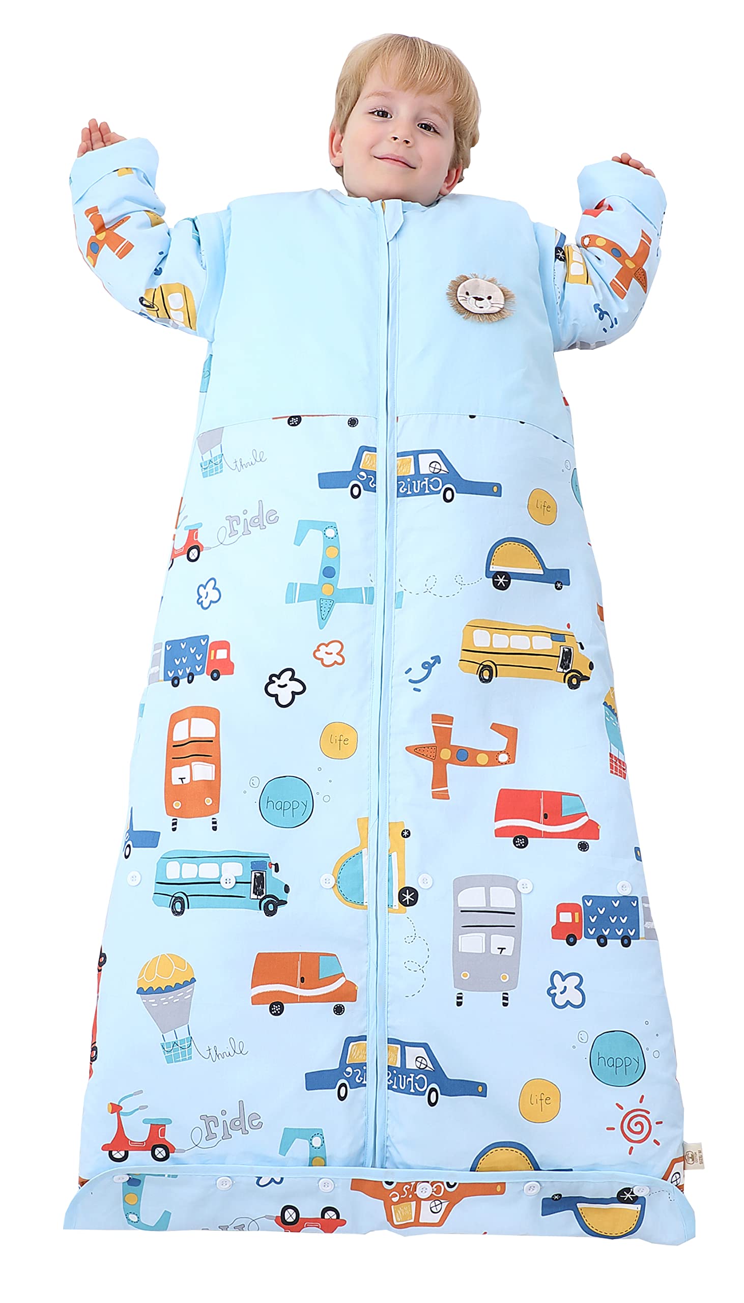 Chilsuessy Winter 2.5 Tog Kids Sleeping Bag with Removable Sleeves Organic Baby Sleeping Bag All Season Sleeping Bag for Boys and Girls 1-10 years old, 2.5 Tog/Colorful Bus, M (70-100 cm)