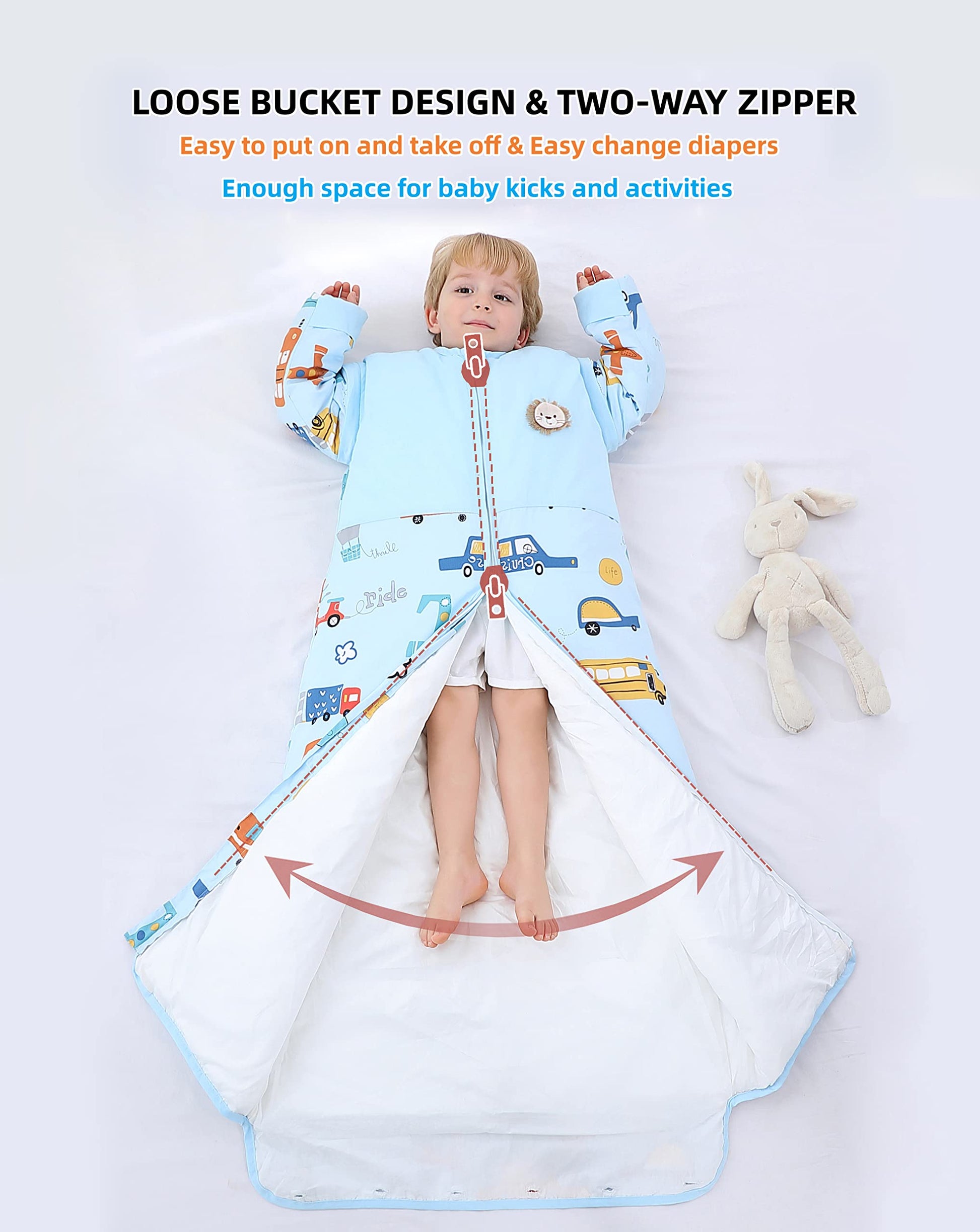 ["High quality fabric and plant print. 100% cotton, skin-friendly, breathable, very comfortable. The print is environmentally friendly and safe, does not fade, does not deform.","2 thicknesses can be freely changed. The inner lining is removable. Remove the inner lining, it is a 1.5 Tog double-layer sleeping bag. With the inner lining, it is a 2.5 Tog sleeping bag for winter.","Removable sleeves and adjustable length. The sleeves are removable, and the button panel at the bottom can make the 'bag part' smaller or fully open (for very warm nights), it is actually an all-season sleeping bag. The length of the sleeping bag can be adjusted at any time according to the baby's height, can be used for a longer time.","Multifunctional sleeping bag for all seasons. Perhaps you are still worried that your child will take off the blanket at night? With this extremely versatile sleeping bag, both the baby and the mother can sleep peacefully.","3 sizes for 1-10 year olds (M: total length: 90cm, suitable for babies height 70-100cm) (L: total length: 120cm, suitable for babies height 100-130cm) (XL: total length: 150cm, suitable for babies height 130-150cm) Our design patent number: 008556294-0001, our sleeping bags have patents for appearance, shape, and other functions in the European Union."]