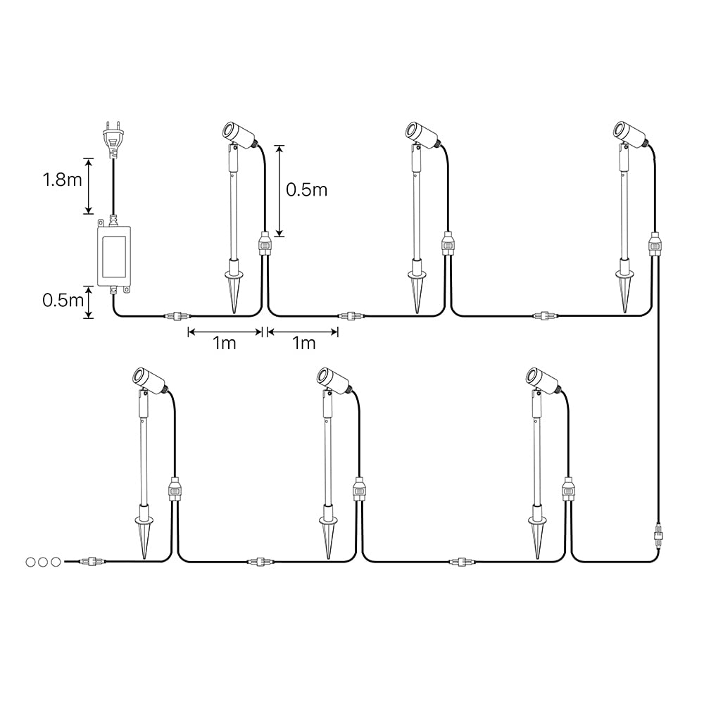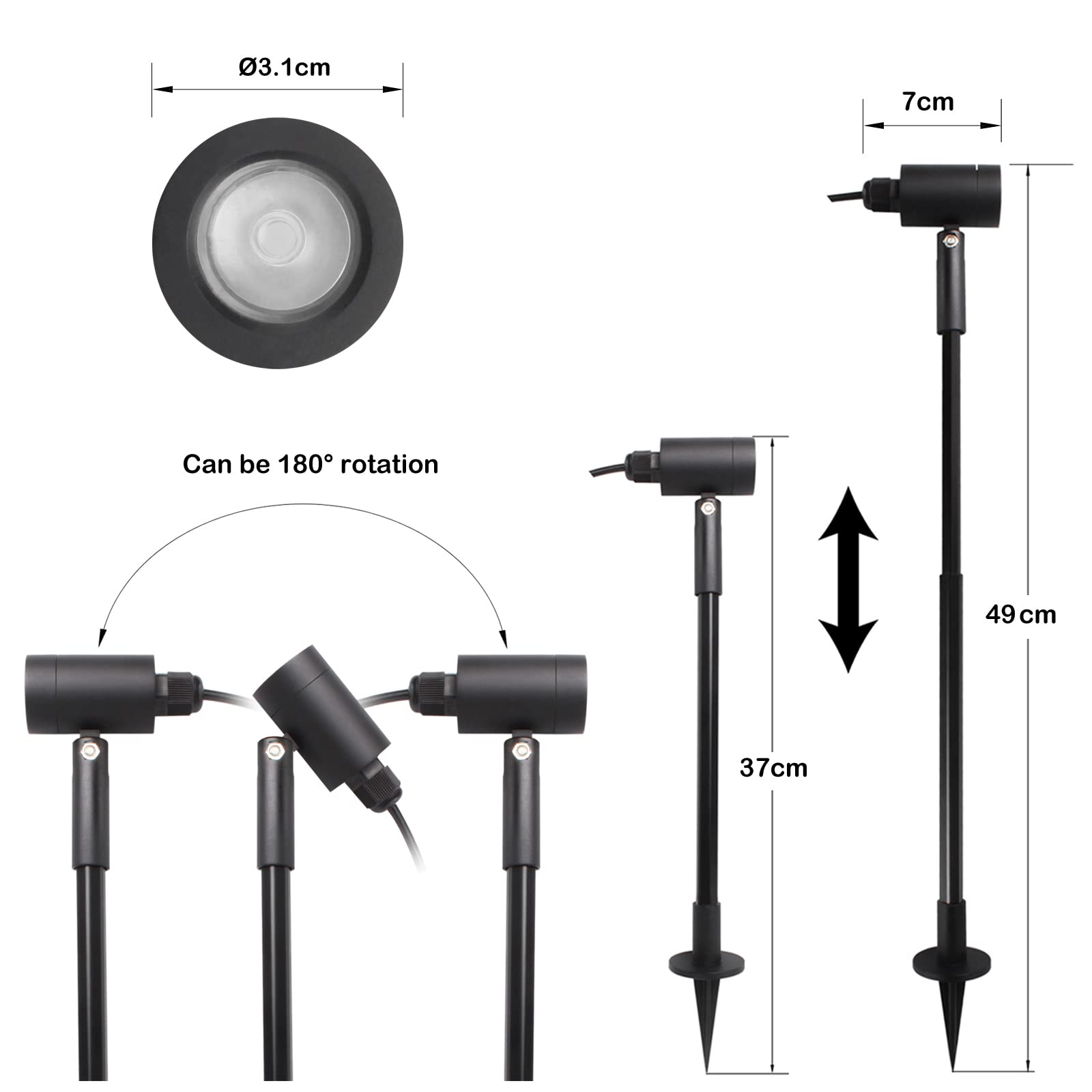 ["Outdoor garden light with ground spike. Can be used as landscape light and street lamp in the suitable position on the ground. Plug-and-play, ideal for outdoor courtyard.","Durable and waterproof. Made of thick, high-quality aluminum die-casting with glass lenses to prevent corrosion and rust. Waterproof IP65 LED landscape lighting significantly improves the stability of outdoor lighting and extends its lifespan.","Modern design. 3W LED garden lights with customizable beam angle provide perfect illumination for plants or facades. Ideal for illuminating plants, facades, flower beds, or as a design fixture for the garden.","High-quality LED garden lighting. LED garden spotlight with plug, 12V safe operating voltage, 180LM. Provides bright and safe environment for passersby at night, perfect for outdoor areas like balconies, courtyards, stairs, gardens, hallways, storage. Illuminated paths are especially important in colder seasons.","Adjustable height LED garden lighting. Height of garden light can be adjusted from 37 to 49 cm, providing smoother height adjustments and better stabilization. Provides enough light and a comfortable atmosphere for your patio, porch, path, deck, pool, courtyard, garden, garage, driveway, pathway, etc."]