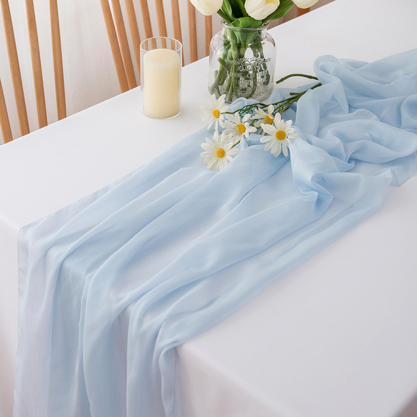 ["Size of the table runner】The size of each organza table runner is approximately 27.5 x 157.5 inches, which is suitable for most types of tables. Large enough to fit rectangular and round tables. This practical gauze table runner can be used as table decoration, but can also be used for chair covers or decorative napkins, backdrop curtains or even gift ribbons.","【Versatile applications】Boho farmhouse rustic table runner is an ideal bohemian party accessory for any occasion, especially for weddings or celebrations. It is unique and elegant for your wedding table, Christmas table runner, bridal and baby shower, party, birthday table decoration, sand ceremony, photo booths, candlelight dinner / garden dinner party and other special events.","【Soft and durable material】This table runner with pleated structure is made from soft, high-quality chiffon fabric, which is characterized by good durability and flexibility; the surfaces are smooth and pleasant to the touch; the edge of the table runner is not sewn, so it remains in the most natural state and we can cut and design it as desired.","【Elegant design】This rectangular romantic vintage gauze table runner is perfect for creating beautiful folds or laying it loosely on the floor to add a delicate, soft, natural fall, soft and smooth, noble and elegant, especially suitable for bohemian, chic or other modern themes. You can also tie a bow to make the wedding table runner look even more special, it can also be used as an embellishment for chair covers.","【Easy washing and care】These vintage wedding table runners are recommended for hand washing in cold water with mild detergent, or machine washing on the gentle cycle with a laundry bag. Dry cleaning is not recommended, air dry naturally. The high quality ensures that our chiffon wedding table runners are durable, the color stays for a long time, does not fade, and can be reused."]