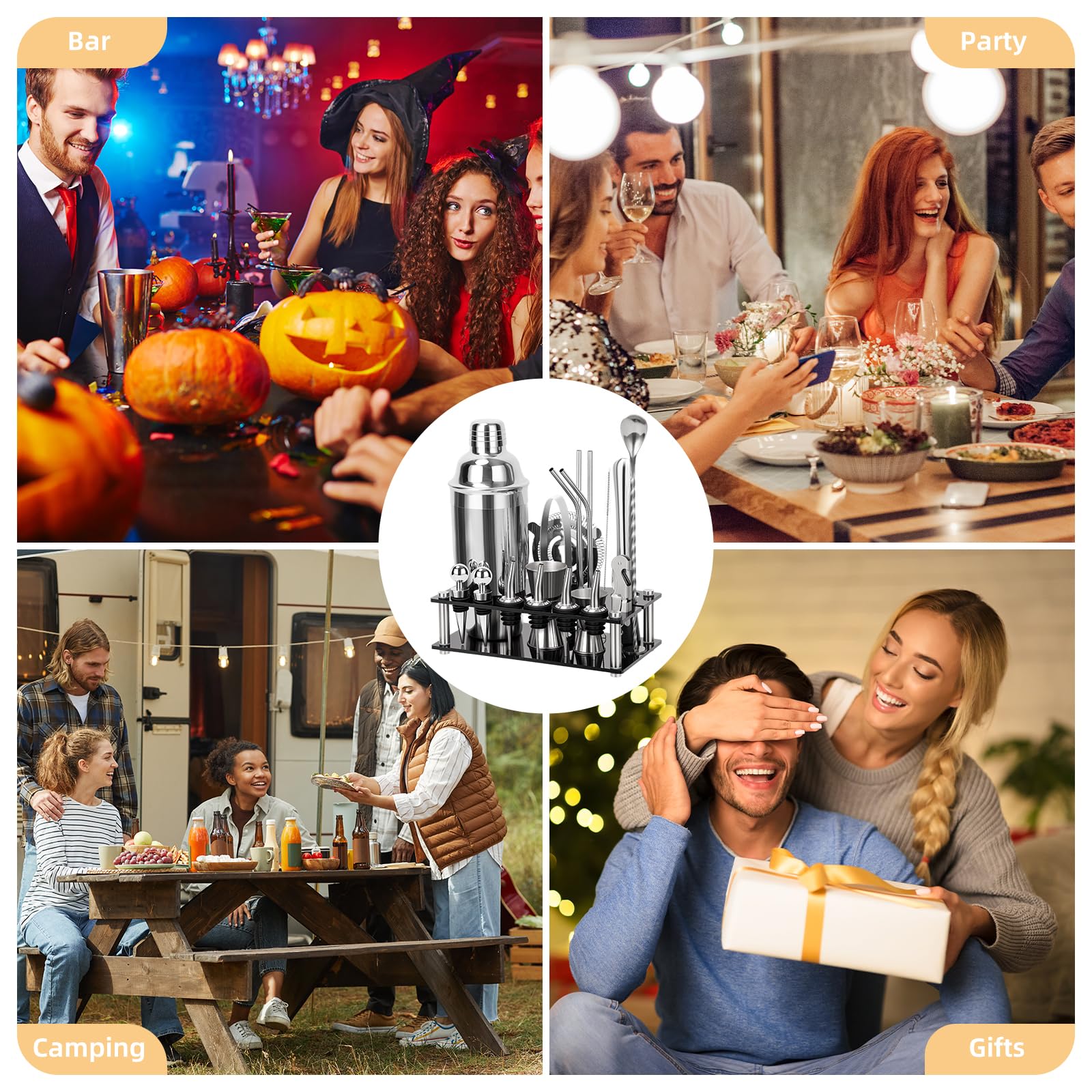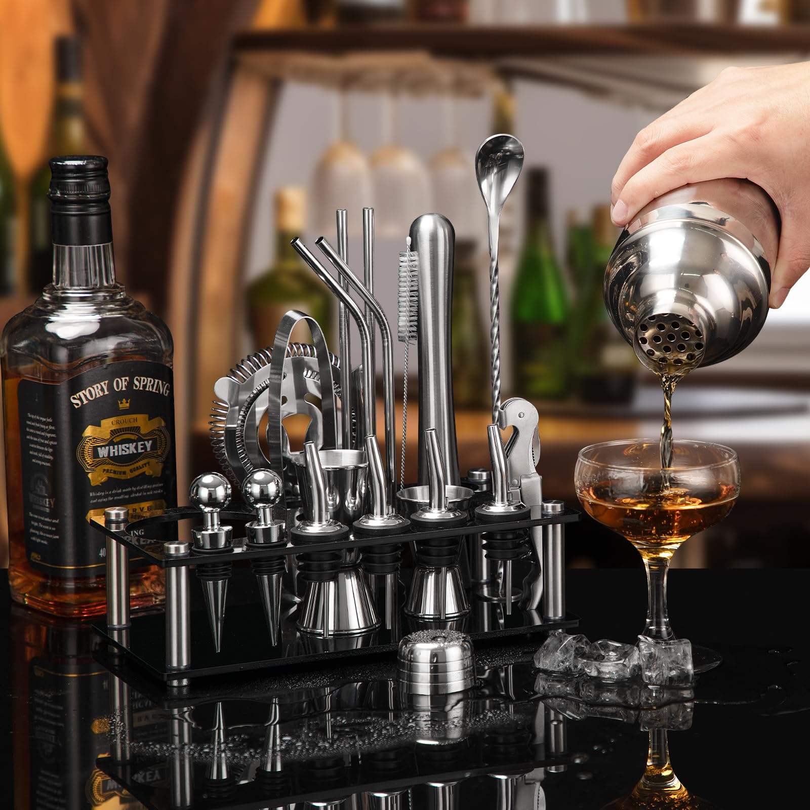 ["🍷High Quality: Cocktail shaker set are made of durable stainless steel. The material of the bartender set is dishwasher safe, rust acid resistant & extremely durable.","🍷20Pcs Cocktail Shaker Set: Includes 1x Cocktail Shaker, 2x Jigger, 4x Pourers, 1x Ice Tongs, 1x Muddler, 2x Stoppers, 1x Stirring Spoon, 1x Corkscrew, 1x Strainer, 1x Brush, 4x Straws, 1x stand.","🍷Good Airtightness: After a unique manufacturing process, the shaker can be perfectly sealed to prevent liquid from leaking during use. You can shake it with confidence,","🍷Application: Can be used in the bar, party or at home. Shaker set allows you to create any kind of drink. With this professional cocktail shaker, you can make Mojito, Martini, Margaritas, Scotch, Rum, and more.","🍷Perfect Gift Choice: Whether it's Christmas, New Year, anniversary, Valentine's Day, birthday, wedding, Father's Day or any other occasion, it's also the perfect gift for your friends and family, it's an ideal gift for beginners or professional bartenders."]