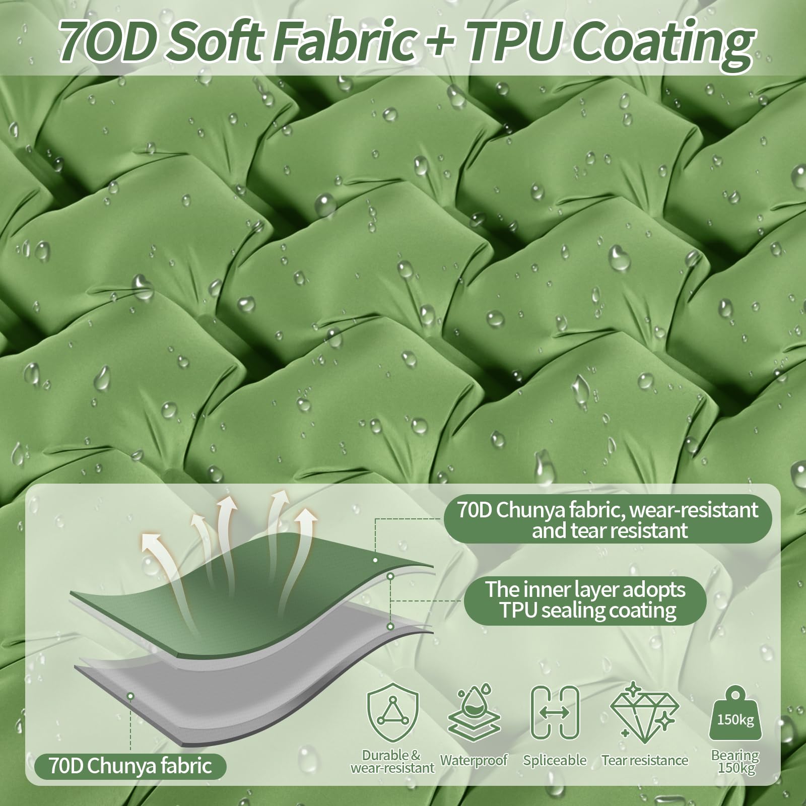 High-Quality Material: The sleeping pad is made of high-quality double-sided 70D polyester pongee comfort fabric, which is waterproof, wear-resistant, tear-resistant, and puncture-resistant. It has good elasticity and tight sealing to prevent air leaks and ensure a comfortable sleep. The maximum load capacity of the camping air mattress is 150 kg.
