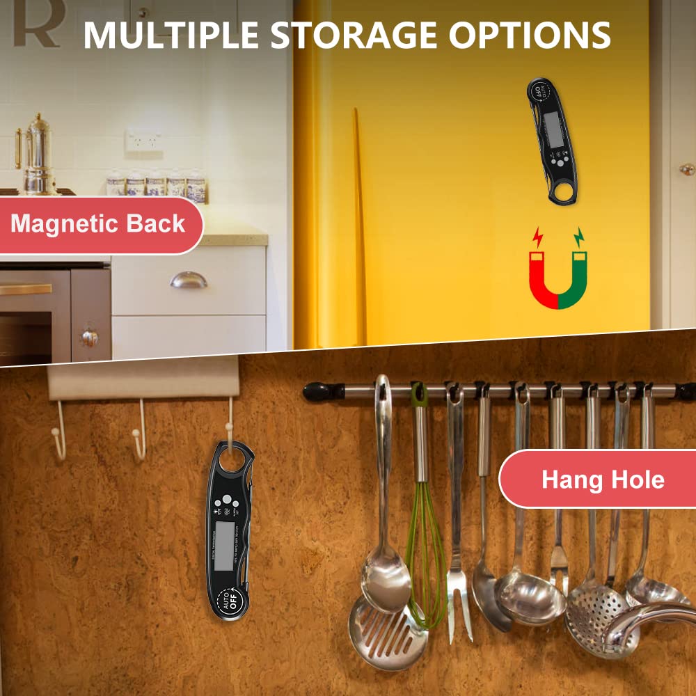 [User-Friendly] The CIRYCASE kitchen thermometer with folding probe offers convenient storage as it can be easily folded up. With the built-in magnet and convenient hanging hole, it can be easily attached to the oven, refrigerator, or other suitable surfaces. The thermometer comes with an internal CR2032 battery, ready for use (Includes 2 CR2032 batteries). It also includes a detailed meat temperature chart to help you effortlessly prepare delicious dishes."
