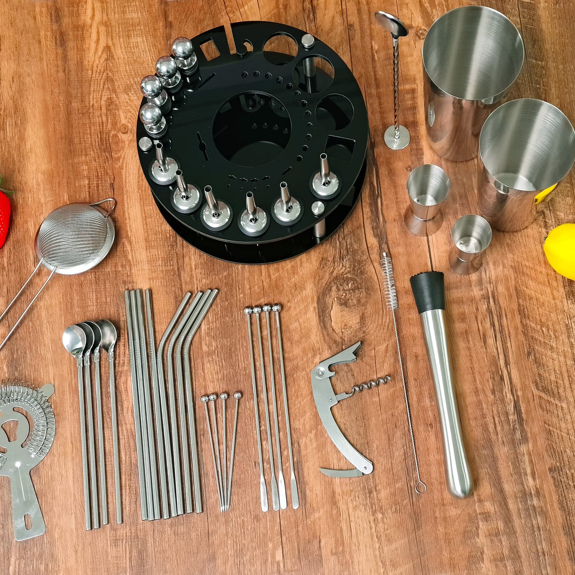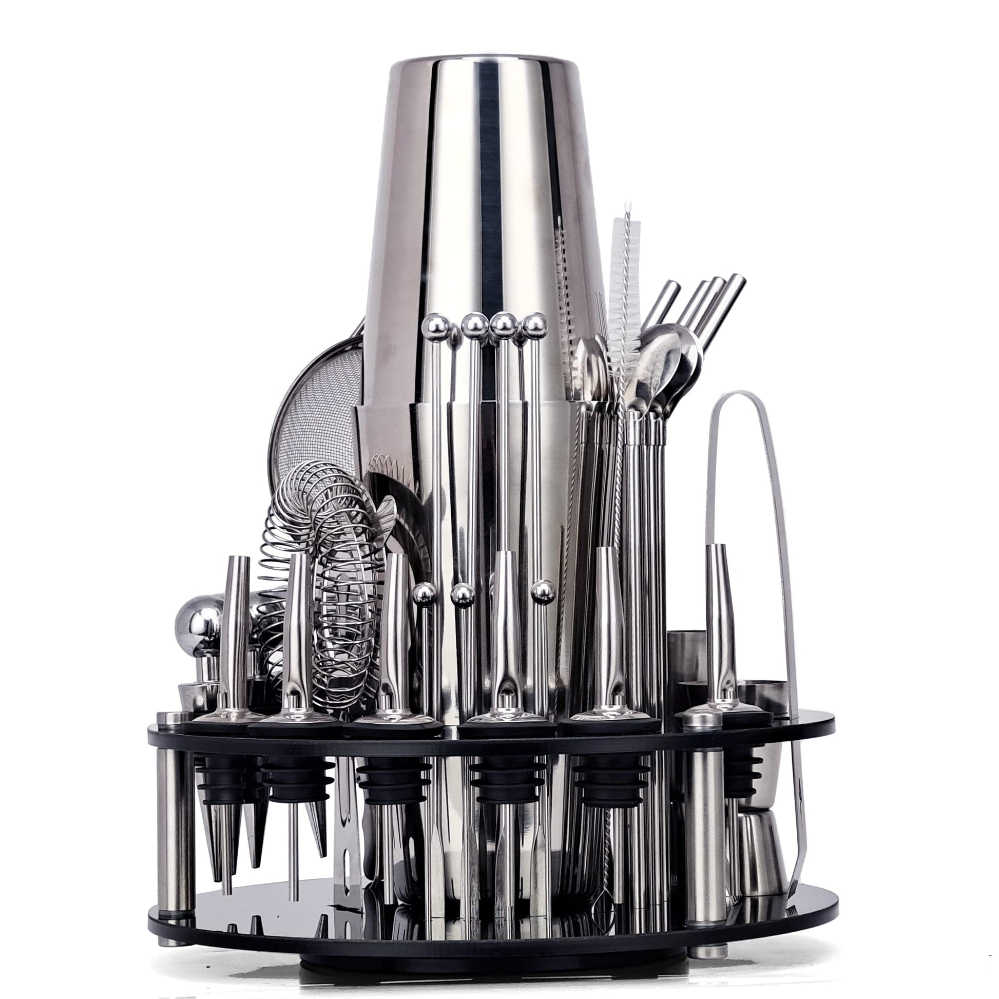 "🍸【360° Rotating Holder】. High-quality cocktail set with acrylic-perspex holder, each tool and barware has specific slots. The well-designed 360-degree rotating holder allows you to not only easily find your tools but also make your bar more organized and a perfect decoration! Who doesn't love such a fine bartender set! (Don't worry! Everything is dishwasher safe. Top quality guaranteed)",