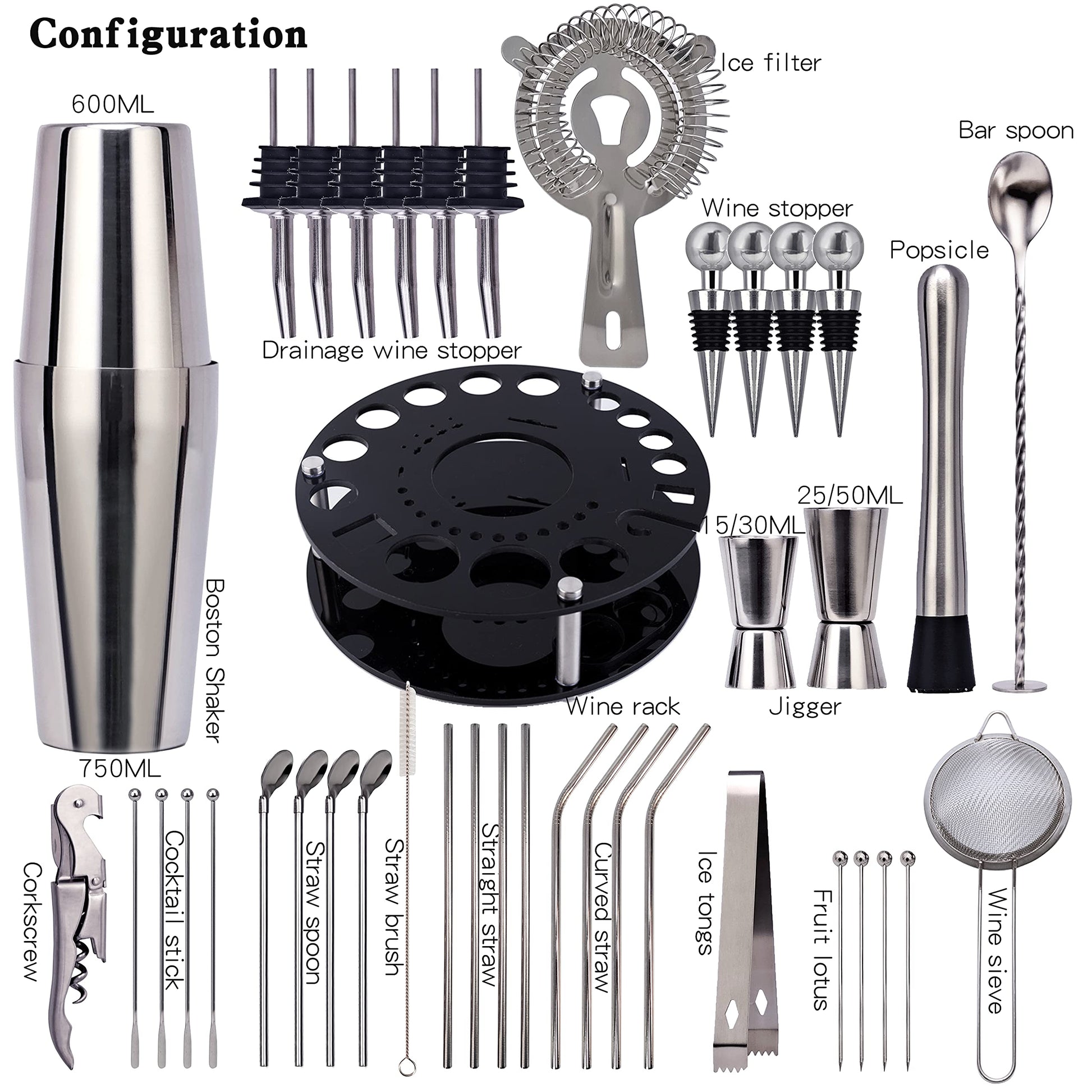 ["🍸【41 Sets Professional Cocktail】 Ice filter*1, Bar spoon*1, Wine stopper*4, Ice tongs*1, Pourer*6, 0.84/1.69 oz Jigger*1, 0.51/1.01 oz Jigger*1, 25.36 oz Shaker*1, 12.68 oz Shaker*1, 25.36 oz Shaker*1, 360° Bottle holder*1, Corkscrew*1, Straight straw*4, Straw spoon*4, Straw spoon*4, Straw brush*1, Cocktail pick*3, Fruit lotus*4, Ice tong*1, Wine strainer*1, Starter recipe book for bartenders.",